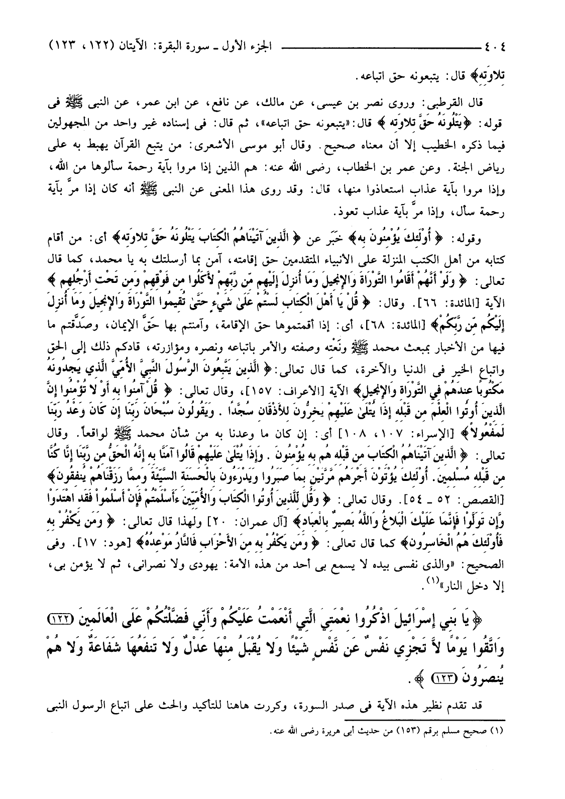 قَالَ الْقُرْطُبِيُّ: وَرَوَى نَصْرُ بْنُ عِيسَى، عَنْ مَالِكٍ، عَنْ نَافِعٍ، عَنِ ابْنِ عُمَرَ، عَنِ النَّبِيِّ صَلَّى اللَّهُ عَلَيْهِ وَسَلَّمَ فِي قَوْلِهِ: {يَتْلُونَهُ حَقَّ تِلاوَتِهِ} قَالَ: "يَتَّبِعُونَهُ حَقَّ اتِّبَاعِهِ"، ثُمَّ قَالَ: فِي إِسْنَادِهِ غَيْرُ وَاحِدٍ مِنَ الْمَجْهُولِينَ فِيمَا ذَكَرَهُ الْخَطِيبُ إِلَّا أَنَّ مَعْنَاهُ صَحِيحٌ. وَقَالَ أَبُو مُوسَى الْأَشْعَرِيُّ: مَنْ يَتَّبِعُ الْقُرْآنَ يَهْبِطُ بِهِ عَلَى رِيَاضِ الْجَنَّةِ. وَعَنْ عُمَرَ بْنِ الْخَطَّابِ، رَضِيَ اللَّهُ عَنْهُ: هُمُ الَّذِينَ إِذَا مَرُّوا بِآيَةِ رَحْمَةٍ سَأَلُوهَا مِنَ اللَّهِ، وَإِذَا مَرُّوا بِآيَةِ عَذَابٍ اسْتَعَاذُوا مِنْهَا، قَالَ: وَقَدْ رُوِيَ هَذَا الْمَعْنَى عَنِ النَّبِيِّ صَلَّى اللَّهُ عَلَيْهِ وَسَلَّمَ أَنَّهُ كَانَ إِذَا مرَّ بِآيَةِ رَحْمَةٍ سَأَلَ، وَإِذَا مرَّ بِآيَةِ عَذَابٍ تَعَوَّذَ.