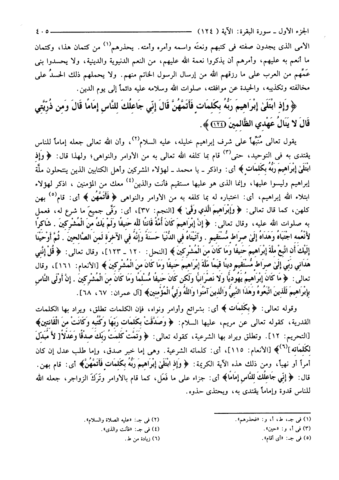يَقُولُ تَعَالَى مُنَبِّهًا عَلَى شَرَفِ إِبْرَاهِيمَ خَلِيلِهِ، عَلَيْهِ السَّلَامُ (2) وَأَنَّ اللَّهَ تَعَالَى جَعَلَهُ إِمَامًا لِلنَّاسِ يُقْتَدَى بِهِ فِي التَّوْحِيدِ، حَتَّى (3) قَامَ بِمَا كَلَّفَهُ اللَّهُ تَعَالَى بِهِ مِنَ الْأَوَامِرِ وَالنَّوَاهِي؛ وَلِهَذَا قَالَ: {وَإِذِ ابْتَلَى إِبْرَاهِيمَ رَبُّهُ بِكَلِمَاتٍ} أَيْ: وَاذْكُرْ -يَا مُحَمَّدُ -لِهَؤُلَاءِ الْمُشْرِكِينَ وَأَهْلِ الْكِتَابَيْنِ الَّذِينَ يَنْتَحِلُونَ ملَّة إِبْرَاهِيمَ وَلَيْسُوا عَلَيْهَا، وَإِنَّمَا الذِي هُوَ عَلَيْهَا مُسْتَقِيمٌ فَأَنْتَ وَالَّذِينَ (4) مَعَكَ مِنَ الْمُؤْمِنِينَ، اذْكُرْ لِهَؤُلَاءِ ابْتِلَاءَ اللَّهِ إِبْرَاهِيمَ، أَيِ: اخْتِبَارُهُ لَهُ بِمَا كَلَّفَهُ بِهِ مِنَ الْأَوَامِرِ وَالنَّوَاهِي {فَأَتَمَّهُنَّ} أَيْ: قَامَ (5) بِهِنَّ كُلِّهِنَّ، كَمَا قَالَ تَعَالَى: {وَإِبْرَاهِيمَ الَّذِي وَفَّى} [النَّجْمِ: 37] ، أَيْ: وَفَّى جَمِيعَ مَا شَرَعَ لَهُ، فَعَمِلَ بِهِ صَلَوَاتُ اللَّهِ عَلَيْهِ، وَقَالَ تَعَالَى: {إِنَّ إِبْرَاهِيمَ كَانَ أُمَّةً قَانِتًا لِلَّهِ حَنِيفًا وَلَمْ يَكُ مِنَ الْمُشْرِكِينَ* شَاكِرًا لأنْعُمِهِ اجْتَبَاهُ وَهَدَاهُ إِلَى صِرَاطٍ مُسْتَقِيمٍ* وَآتَيْنَاهُ فِي الدُّنْيَا حَسَنَةً وَإِنَّهُ فِي الآخِرَةِ لَمِنَ الصَّالِحِينَ* ثُمَّ أَوْحَيْنَا إِلَيْكَ أَنِ اتَّبِعْ مِلَّةَ إِبْرَاهِيمَ حَنِيفًا وَمَا كَانَ مِنَ الْمُشْرِكِينَ} [النَّحْلِ: 120 -123] ، وَقَالَ تَعَالَى: {قُلْ إِنَّنِي هَدَانِي رَبِّي إِلَى صِرَاطٍ مُسْتَقِيمٍ دِينًا قِيَمًا مِلَّةَ إِبْرَاهِيمَ حَنِيفًا وَمَا كَانَ مِنَ الْمُشْرِكِينَ} [الْأَنْعَامِ: 161] ، وَقَالَ تَعَالَى: {مَا كَانَ إِبْرَاهِيمُ يَهُودِيًّا وَلا نَصْرَانِيًّا وَلَكِنْ كَانَ حَنِيفًا مُسْلِمًا وَمَا كَانَ مِنَ الْمُشْرِكِينَ* إِنَّ أَوْلَى النَّاسِ بِإِبْرَاهِيمَ لَلَّذِينَ اتَّبَعُوهُ وَهَذَا النَّبِيُّ وَالَّذِينَ آمَنُوا وَاللَّهُ وَلِيُّ الْمُؤْمِنِينَ} [آلِ عِمْرَانَ: 67، 68]