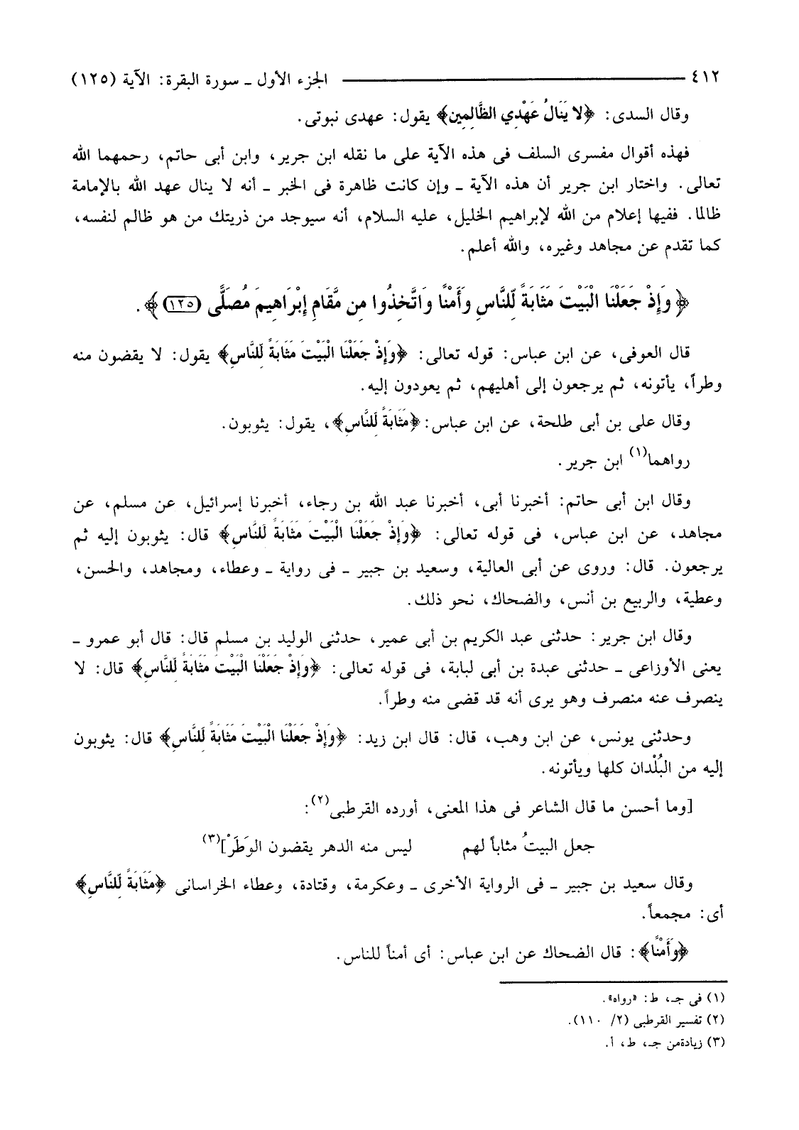وَقَالَ ابْنُ أَبِي حَاتِمٍ: أَخْبَرَنَا أَبِي، أَخْبَرَنَا عَبْدُ اللَّهِ بْنُ رَجَاءٍ، أَخْبَرَنَا إِسْرَائِيلُ، عَنْ مُسْلِمٍ، عَنْ مُجَاهِدٍ، عَنِ ابْنِ عَبَّاسٍ، فِي قَوْلِهِ تعالى: {وَإِذْ جَعَلْنَا الْبَيْتَ مَثَابَةً لِلنَّاسِ} قَالَ: يَثُوبُونَ إِلَيْهِ ثُمَّ يَرْجِعُونَ. قَالَ: وَرُوِيَ عَنْ أَبِي الْعَالِيَةِ، وَسَعِيدِ بْنِ جُبَيْرٍ-فِي رِوَايَةٍ -وَعَطَاءٍ، وَمُجَاهِدٍ، وَالْحَسَنِ، وَعَطِيَّةَ، وَالرَّبِيعِ بْنِ أَنَسٍ، وَالضَّحَّاكِ، نَحْوَ ذَلِكَ. وَقَالَ ابْنُ جَرِيرٍ: حَدَّثَنِي عَبْدُ الْكَرِيمِ بْنُ أَبِي عُمَيْرٍ، حَدَّثَنِي الْوَلِيدُ بْنُ مُسْلِمٍ قَالَ: قَالَ أَبُو عَمْرٍو -يَعْنِي الْأَوْزَاعِيَّ -حَدَّثَنِي عَبْدَةُ بْنُ أَبِي لُبَابَةَ، فِي قَوْلِهِ تَعَالَى: {وَإِذْ جَعَلْنَا الْبَيْتَ مَثَابَةً لِلنَّاسِ} قَالَ: لَا يَنْصَرِفُ عَنْهُ مُنْصَرِفٌ وَهُوَ يَرَى أَنَّهُ قَدْ قَضَى مِنْهُ وَطَرًا.
