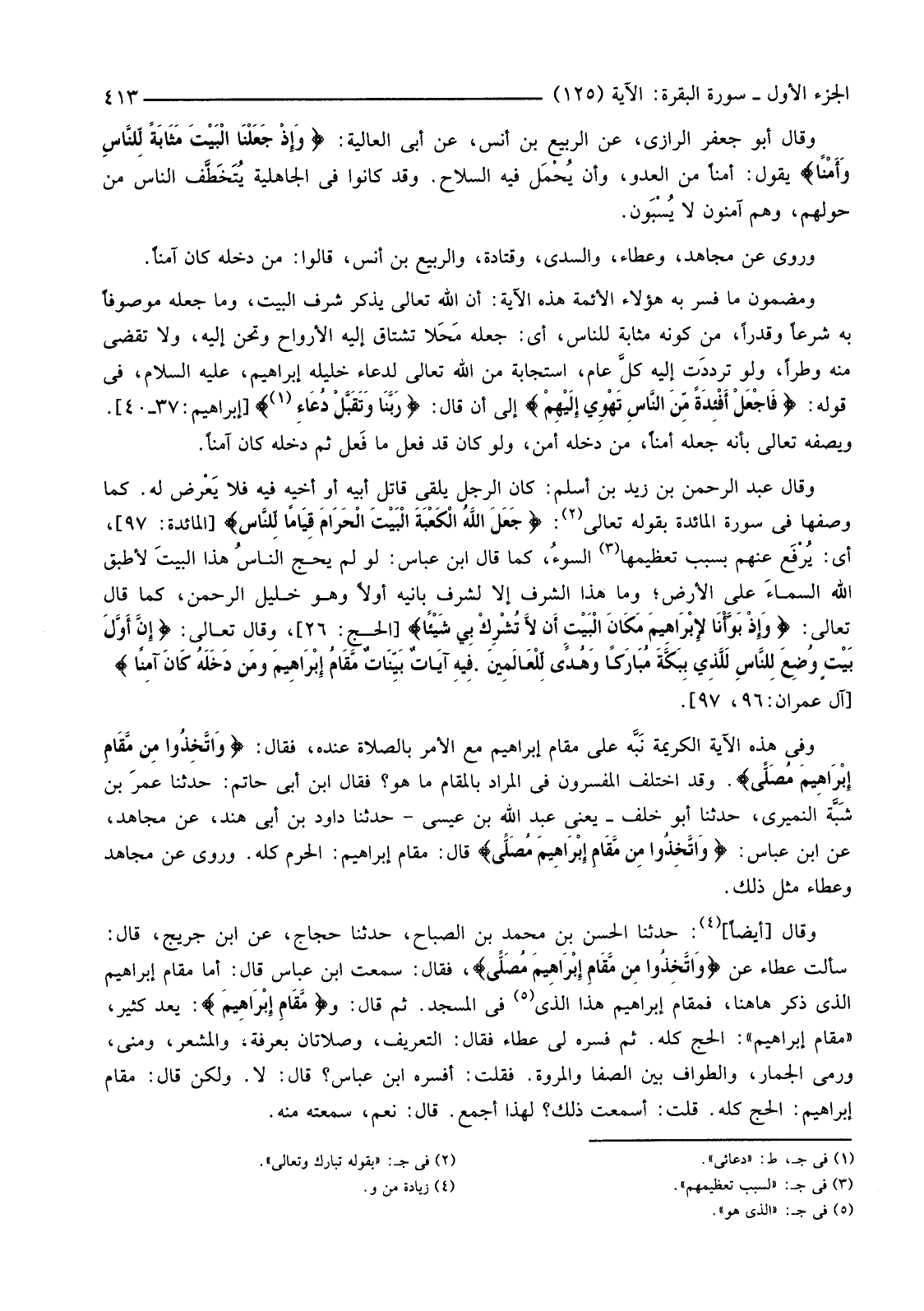 وَفِي هَذِهِ الْآيَةِ الْكَرِيمَةِ نَبَّه عَلَى مَقَامِ إِبْرَاهِيمَ مَعَ الْأَمْرِ بِالصَّلَاةِ عِنْدَهُ. فَقَالَ: {وَاتَّخِذُوا مِنْ مَقَامِ إِبْرَاهِيمَ مُصَلًّى} وَقَدِ اخْتَلَفَ الْمُفَسِّرُونَ فِي الْمُرَادِ بِالْمَقَامِ مَا هُوَ؟ فَقَالَ ابْنُ أَبِي حَاتِمٍ: أَخْبَرَنَا عُمَرُ بْنُ شَبَّة النُّمَيْرِيُّ، حَدَّثَنَا أَبُو خَلَفٍ -يَعْنِي عَبْدَ اللَّهِ بْنَ عِيسَى-حَدَّثَنَا دَاوُدُ بْنُ أَبِي هِنْدٍ، عَنْ مُجَاهِدٍ، عَنِ ابْنِ عَبَّاسٍ: {وَاتَّخِذُوا مِنْ مَقَامِ إِبْرَاهِيمَ مُصَلًّى} قَالَ: مَقَامُ إِبْرَاهِيمَ: الْحَرَمُ كُلُّهُ. وَرُوِيَ عَنْ مُجَاهِدٍ وَعَطَاءٍ مِثْلَ ذَلِكَ.