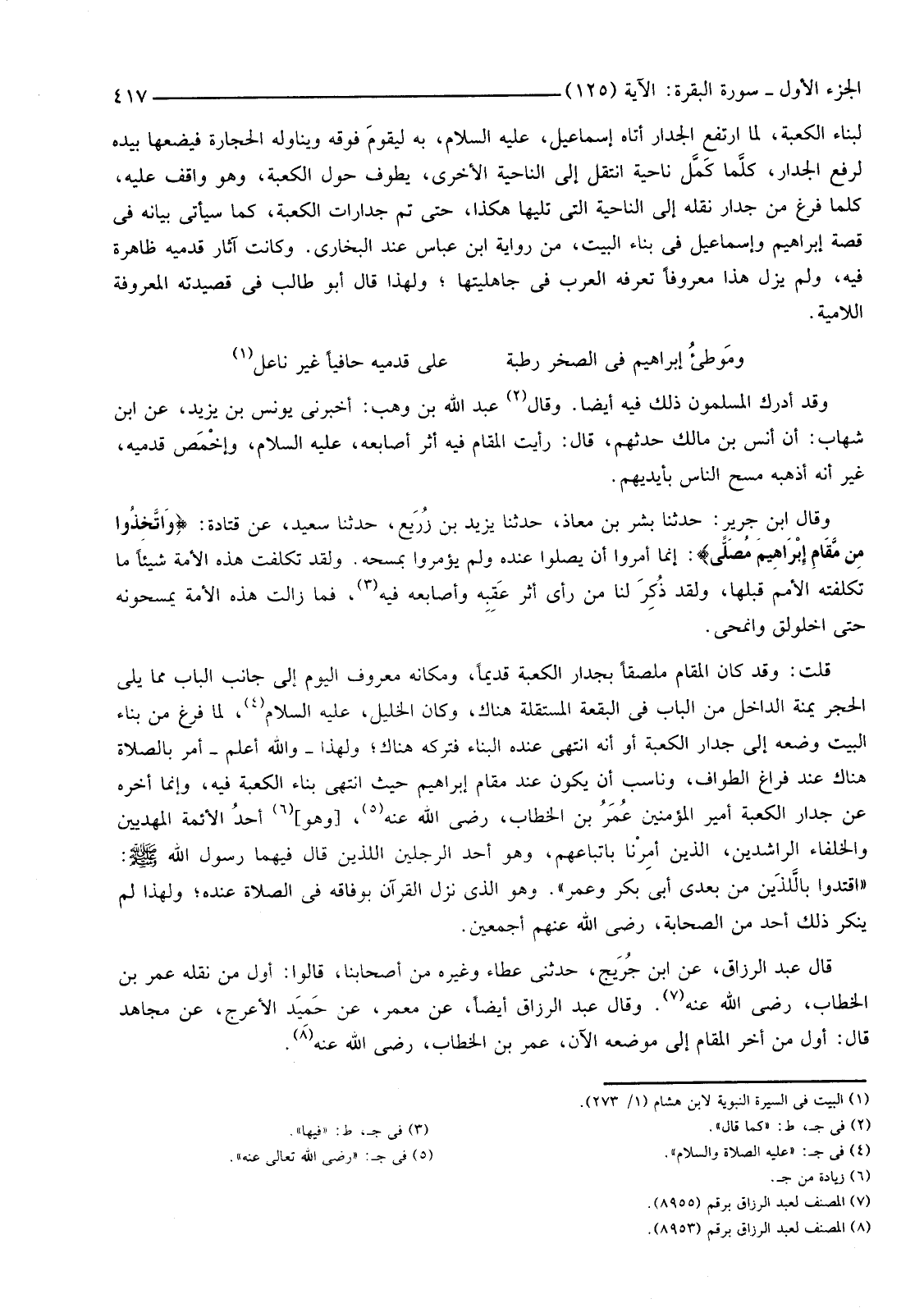 قُلْتُ: وَقَدْ كَانَ الْمَقَامُ مُلْصَقًا بِجِدَارِ الْكَعْبَةِ قَدِيمًا، وَمَكَانُهُ مَعْرُوفٌ الْيَوْمَ إِلَى جَانِبِ الْبَابِ مِمَّا يَلِي الْحَجَرَ يُمْنَةَ الدَّاخِلِ مِنَ الْبَابِ فِي الْبُقْعَةِ الْمُسْتَقِلَّةِ هُنَاكَ، وَكَانَ الْخَلِيلُ، عَلَيْهِ السَّلَامُ (4) لَمَّا فَرَغَ مِنْ بِنَاءِ الْبَيْتِ وَضَعَهُ إِلَى جِدَارِ الْكَعْبَةِ أَوْ أَنَّهُ انْتَهَى عِنْدَهُ الْبِنَاءُ فَتَرَكَهُ هُنَاكَ؛ وَلِهَذَا -وَاللَّهُ أَعْلَمُ-أُمِرَ بِالصَّلَاةِ هُنَاكَ عِنْدَ فَرَاغِ الطَّوَافِ، وَنَاسَبَ أَنْ يَكُونَ عِنْدَ مَقَامِ إِبْرَاهِيمَ حَيْثُ انْتَهَى بِنَاءُ الْكَعْبَةِ فِيهِ، وَإِنَّمَا أَخَّرَهُ عَنْ جِدَارِ الْكَعْبَةِ أَمِيرُ الْمُؤْمِنِينَ عُمَرُ بْنُ الْخَطَّابِ رَضِيَ اللَّهُ عَنْهُ (5) [وَهُوَ] (6) أحدُ الْأَئِمَّةِ الْمَهْدِيِّينَ وَالْخُلَفَاءِ الرَّاشِدِينَ، الَّذِينَ أُمِرْنا بِاتِّبَاعِهِمْ، وَهُوَ أَحَدُ الرَّجُلَيْنِ اللَّذَيْنِ قَالَ فِيهِمَا رَسُولُ اللَّهِ صَلَّى اللَّهُ عَلَيْهِ وَسَلَّمَ: "اقْتَدَوْا باللَّذَين مِنْ بَعْدِي أَبِي بَكْرٍ وَعُمَرَ". وَهُوَ الذِي نَزَلَ الْقُرْآنُ بِوِفَاقِهِ فِي الصَّلَاةِ عِنْدَهُ؛ وَلِهَذَا لَمْ يُنْكِرْ ذَلِكَ أَحَدٌ مِنَ الصَّحَابَةِ، رَضِيَ اللَّهُ عَنْهُمْ أَجْمَعِينَ.