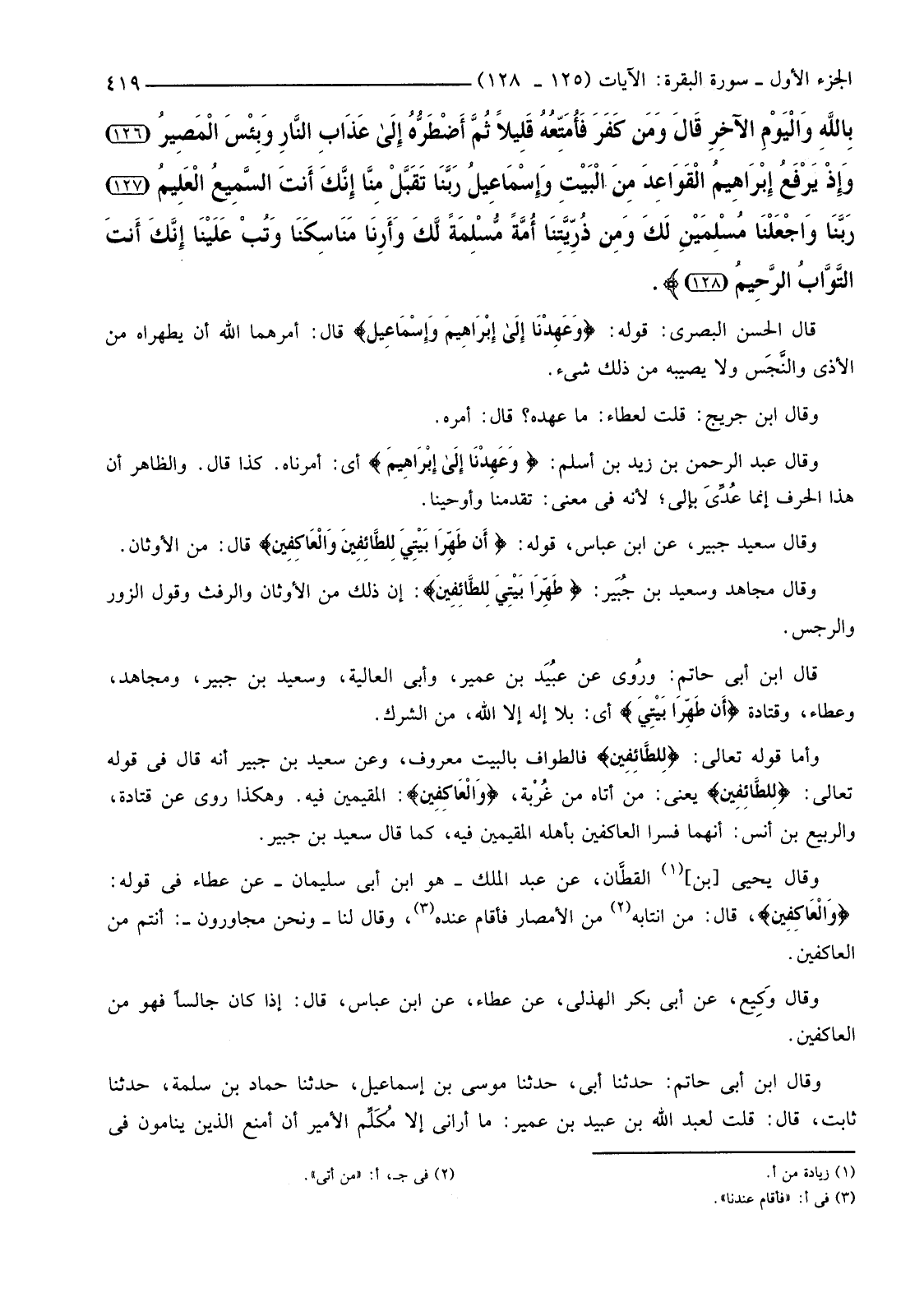 وَقَالَ سَعِيدُ بْنُ جُبَيْرٍ، عَنِ ابْنِ عَبَّاسٍ، قَوْلُهُ: {أَنْ طَهِّرَا بَيْتِيَ لِلطَّائِفِينَ وَالْعَاكِفِينَ} قَالَ: مِنَ الْأَوْثَانِ.