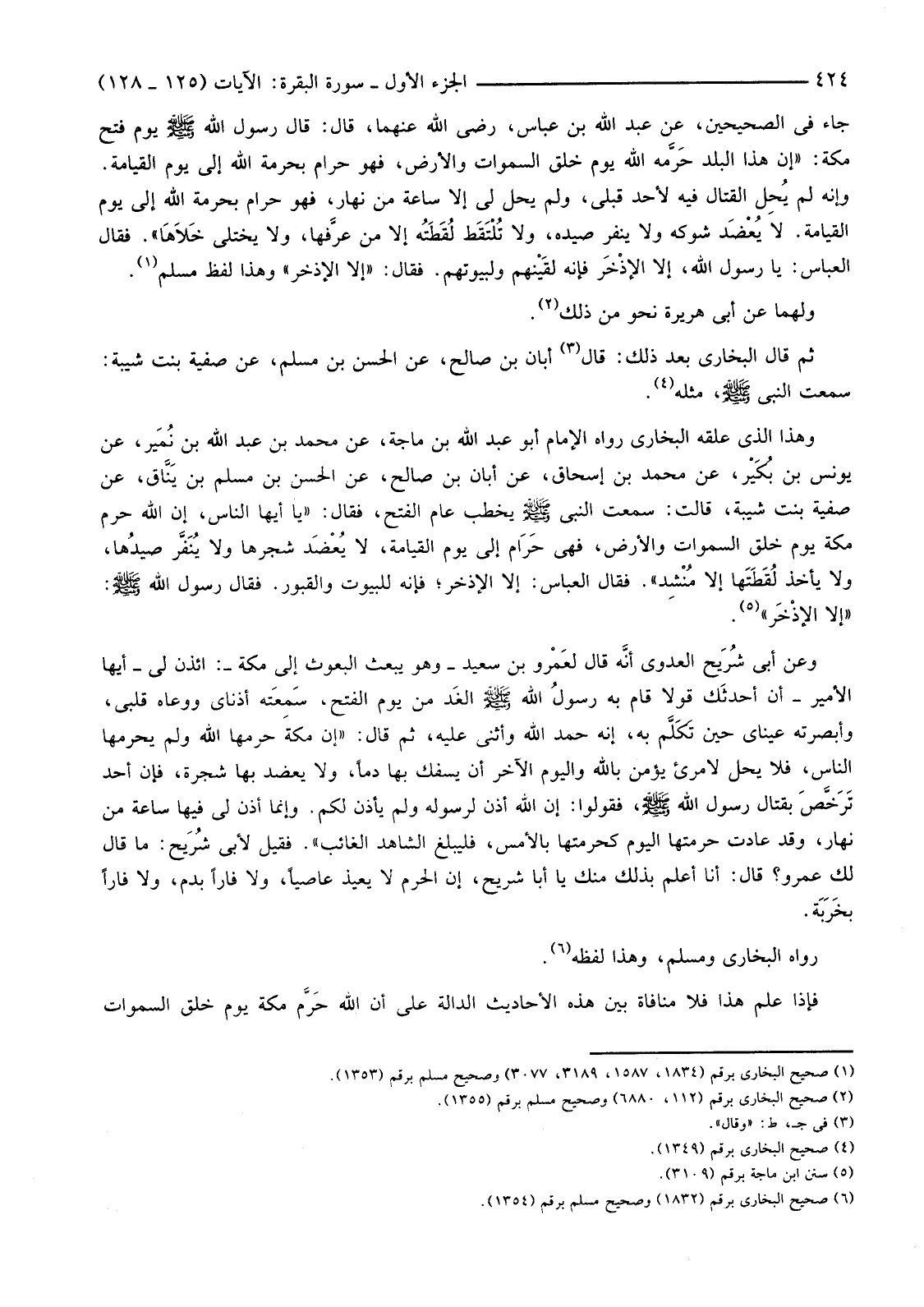 جَاءَ فِي الصَّحِيحَيْنِ، عَنْ عَبْدِ اللَّهِ بْنِ عَبَّاسٍ، رَضِيَ اللَّهُ عَنْهُمَا، قَالَ: قَالَ رَسُولُ اللَّهِ صَلَّى اللَّهُ عَلَيْهِ وَسَلَّمَ يَوْمَ فَتْحِ مَكَّةَ: "إِنَّ هَذَا الْبَلَدَ حَرَّمه اللَّهُ يَوْمَ خَلَقَ السَّمَوَاتِ وَالْأَرْضَ، فَهُوَ حَرَامٌ بِحُرْمَةِ اللَّهِ إِلَى يَوْمِ الْقِيَامَةِ. وَإِنَّهُ لَمْ يحِل الْقِتَالُ فِيهِ لِأَحَدٍ قَبْلِي، وَلَمْ يَحِلَّ لِي إِلَّا ساعة من نهار، فَهُوَ حَرَامٌ بِحُرْمَةِ اللَّهِ إِلَى يَوْمِ الْقِيَامَةِ. لَا يُعْضَد شَوْكُهُ وَلَا يُنَفَّرُ صَيْدُهُ، وَلَا تُلْتَقَط لُقَطَتُه إِلَّا مَنْ عرَّفها، وَلَا يُخْتَلَى خَلاهَا" فَقَالَ الْعَبَّاسُ: يَا رسول الله، إلا الإذْخَر فإنه لقَينهم ولبيوتهم. فَقَالَ: "إِلَّا الْإِذْخِرَ" وَهَذَا لَفْظُ مُسْلِمٍ (1) .