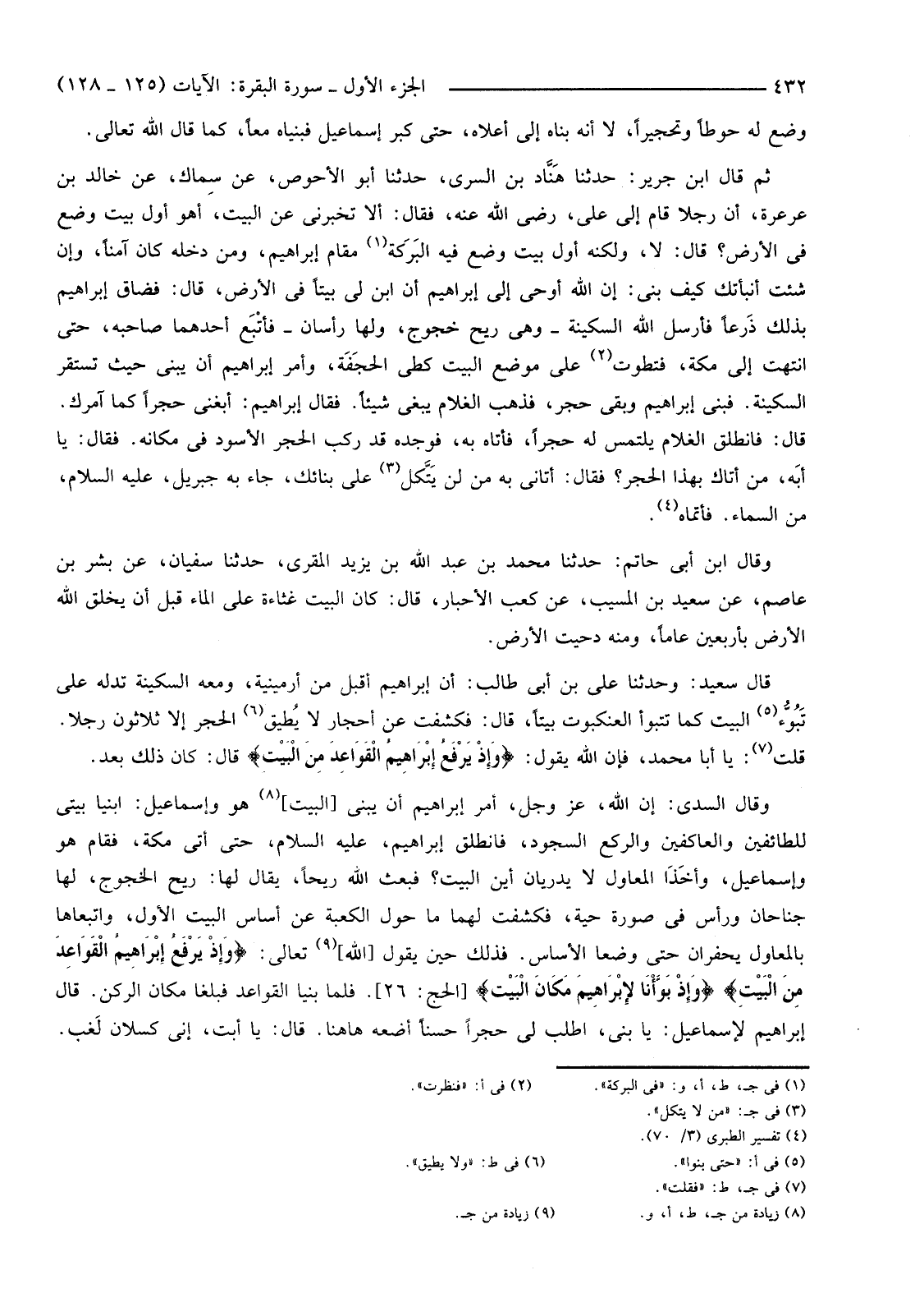 ثُمَّ قَالَ ابْنُ جَرِيرٍ: أَخْبَرَنَا هَنَّاد بْنُ السَّرِيِّ، حَدَّثَنَا أَبُو الْأَحْوَصِ، عَنْ سِماك، عَنْ خَالِدِ بْنِ عَرْعَرَةَ، أَنَّ رَجُلًا قَامَ إِلَى عَلِيٍّ، رَضِيَ اللَّهُ عَنْهُ، فَقَالَ: أَلَا تُخْبِرُنِي عَنِ الْبَيْتِ، أَهُوَ أَوَّلُ بَيْتٍ وُضِعَ فِي الْأَرْضِ؟ فَقَالَ: لَا وَلَكِنَّهُ أَوَّلُ بَيْتٍ وُضِعَ فِيهِ البَرَكة (1) ،مَقَامُ إِبْرَاهِيمَ، وَمَنْ دَخَلَهُ كَانَ آمِنًا، وَإِنْ شِئْتَ أَنْبَأْتُكَ كَيْفَ بُنِيَ: إِنَّ اللَّهَ أَوْحَى إِلَى إِبْرَاهِيمَ أَنِ ابْنِ لِي بَيْتًا فِي الْأَرْضِ، قَالَ: فَضَاقَ إِبْرَاهِيمُ بِذَلِكَ ذَرْعًا فَأَرْسَلَ اللَّهُ السَّكِينَةَ -وَهِيَ رِيحٌ خُجُوجٌ، وَلَهَا رَأْسَانِ -فأتْبَع أَحَدُهُمَا صَاحِبَهُ، حَتَّى انْتَهَتْ إِلَى مَكَّةَ، فَتَطَوَّتْ (2) عَلَى مَوْضِعِ الْبَيْتِ كَطَيِّ الحجفَة، وَأُمِرَ إِبْرَاهِيمُ أَنْ يَبْنِيَ حَيْثُ تَسْتَقِرُّ السَّكِينَةُ. فَبَنَى إِبْرَاهِيمُ وَبَقِيَ حَجَرٌ، فَذَهَبَ الْغُلَامُ يَبْغِي شَيْئًا. فَقَالَ إِبْرَاهِيمُ: أَبْغِنِي حَجَرًا كَمَا آمُرُكَ. قَالَ: فَانْطَلَقَ الْغُلَامُ يَلْتَمِسُ لَهُ حَجَرًا، فَأَتَاهُ بِهِ، فَوَجَدَهُ قَدْ رَكَّبَ الْحَجَرَ الْأَسْوَدَ فِي مَكَانِهِ. فَقَالَ: يَا أَبَهْ، مَنْ أَتَاكَ بِهَذَا الْحَجَرِ؟ فَقَالَ: أَتَانِي بِهِ مَنْ لَنْ يَتَّكل (3) عَلَى بِنَائِكَ، جَاءَ بِهِ جِبْرِيلُ، عَلَيْهِ السَّلَامُ، مِنَ السَّمَاءِ. فَأَتَمَّاهُ (4) .