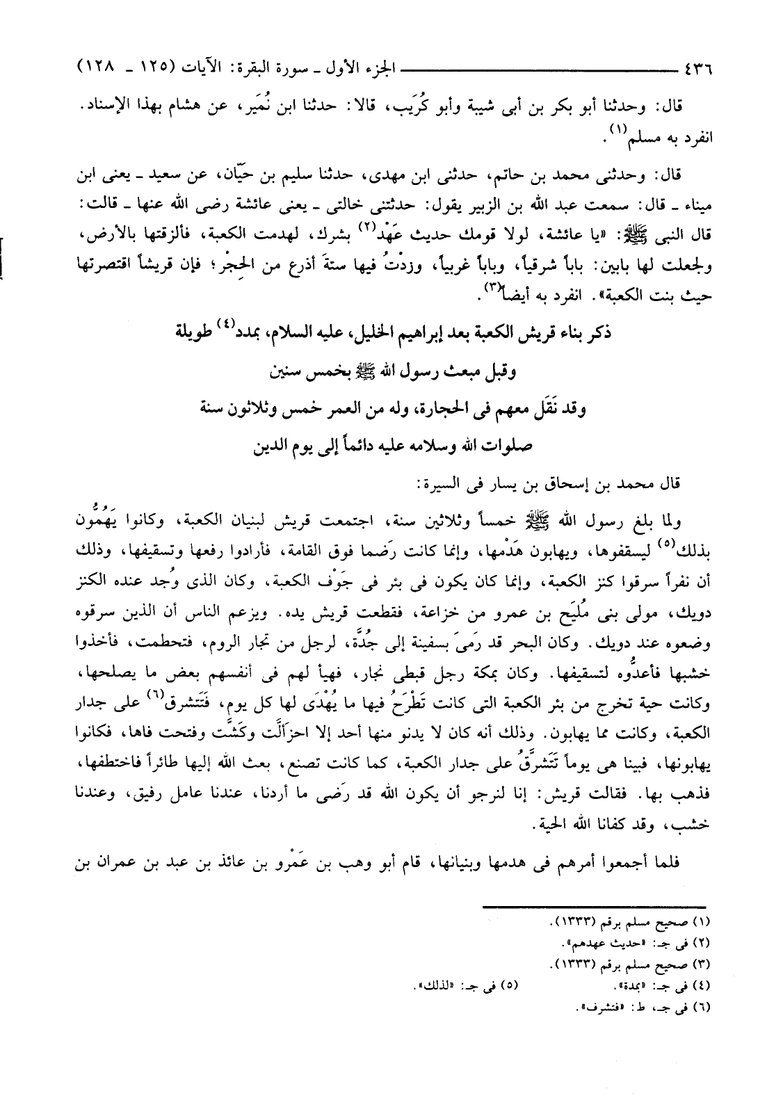 قَالَ: وَحَدَّثَنَا أَبُو بَكْرِ بْنُ أَبِي شَيْبَةَ وَأَبُو كُرَيب، قَالَا حَدَّثَنَا ابْنُ نُمَير، عَنْ هِشَامٍ بِهَذَا الْإِسْنَادِ. انْفَرَدَ بِهِ مُسْلِمٌ (1) ،قَالَ: وَحَدَّثَنِي مُحَمَّدُ بْنُ حَاتِمٍ، حَدَّثَنِي ابْنُ مَهْدِيٍّ، حَدَّثَنَا سُلَيْمُ بْنُ حَيَّان، عَنْ سَعِيدٍ -يَعْنِي ابْنَ مِينَاءَ -قَالَ: سَمِعْتُ عَبْدَ اللَّهِ بْنَ الزُّبَيْرِ يَقُولُ: حَدَّثَتْنِي خَالَتِي -يَعْنِي عَائِشَةَ رَضِيَ اللَّهُ عَنْهَا -قَالَتْ: قَالَ النَّبِيُّ صَلَّى اللَّهُ عَلَيْهِ وَسَلَّمَ:"يَا عائشة، لولا قومك حديث عَهْد (2) بِشِرْكٍ، لَهَدَمْتُ الْكَعْبَةَ، فَأَلَزَقْتُهَا بِالْأَرْضِ، وَلَجَعَلْتُ لَهَا بَابَيْنِ: بَابًا شَرْقِيًّا، وَبَابًا غَرْبِيًّا، وزدتُ فِيهَا سِتَّةَ أَذْرُعٍ مِنَ الحِجْر؛ فَإِنَّ قُرَيْشًا اقْتَصَرَتْهَا حَيْثُ بَنَتِ الْكَعْبَةَ" انْفَرَدَ بِهِ أَيْضًا (3) . ذِكْرُ بِنَاءِ قُرَيْشٍ الْكَعْبَةَ بَعْدَ إِبْرَاهِيمَ الْخَلِيلِ، عَلَيْهِ السَّلَامُ، بِمُدَدٍ (4) طَوِيلَةٍ