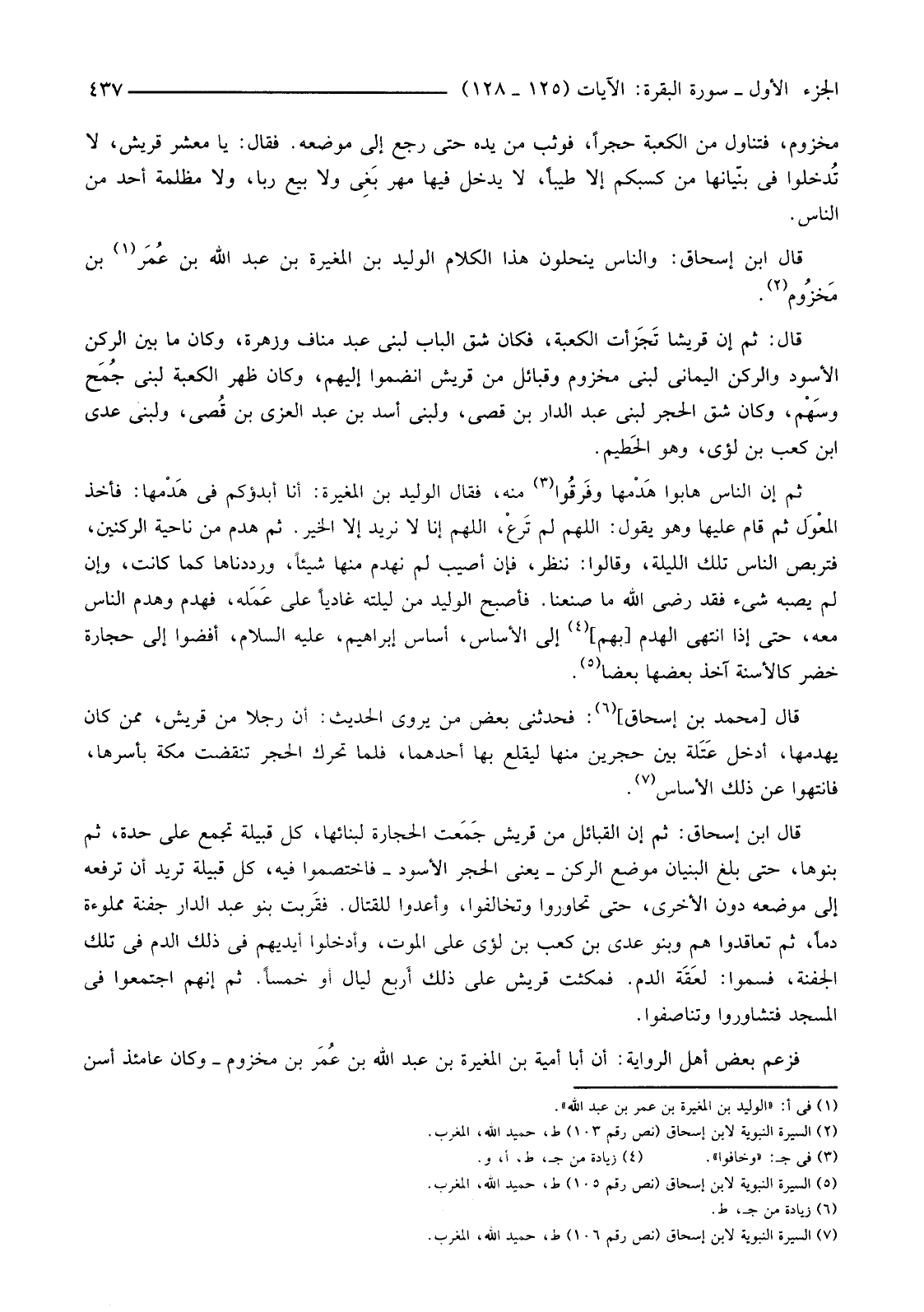(7) السيرة النبوية لابن إسحاق (نص رقم 106) ط، حميد الله، المغرب.