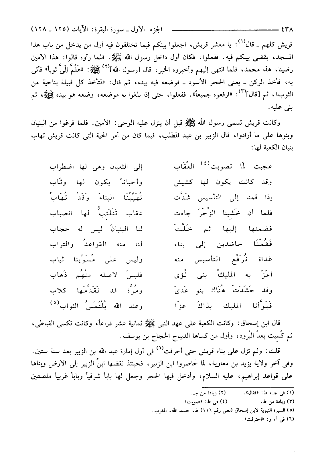 وَكَانَتْ قُرَيْشٌ تُسَمِّي رَسُولَ اللَّهِ صَلَّى اللَّهُ عَلَيْهِ وَسَلَّمَ قَبْلَ أَنْ يَنْزِلَ عَلَيْهِ الْوَحْيُ: الْأَمِينُ. فَلَمَّا فَرَغُوا مِنَ الْبُنْيَانِ وَبَنَوْهَا عَلَى مَا أَرَادُوا، قَالَ الزُّبَيْرُ بْنُ عَبْدِ الْمُطَّلِبِ، فِيمَا كَانَ مِنْ أَمْرِ الْحَيَّةِ التِي كَانَتْ قُرَيْشٌ تَهَابُ بُنْيَانَ الْكَعْبَةِ لَهَا: