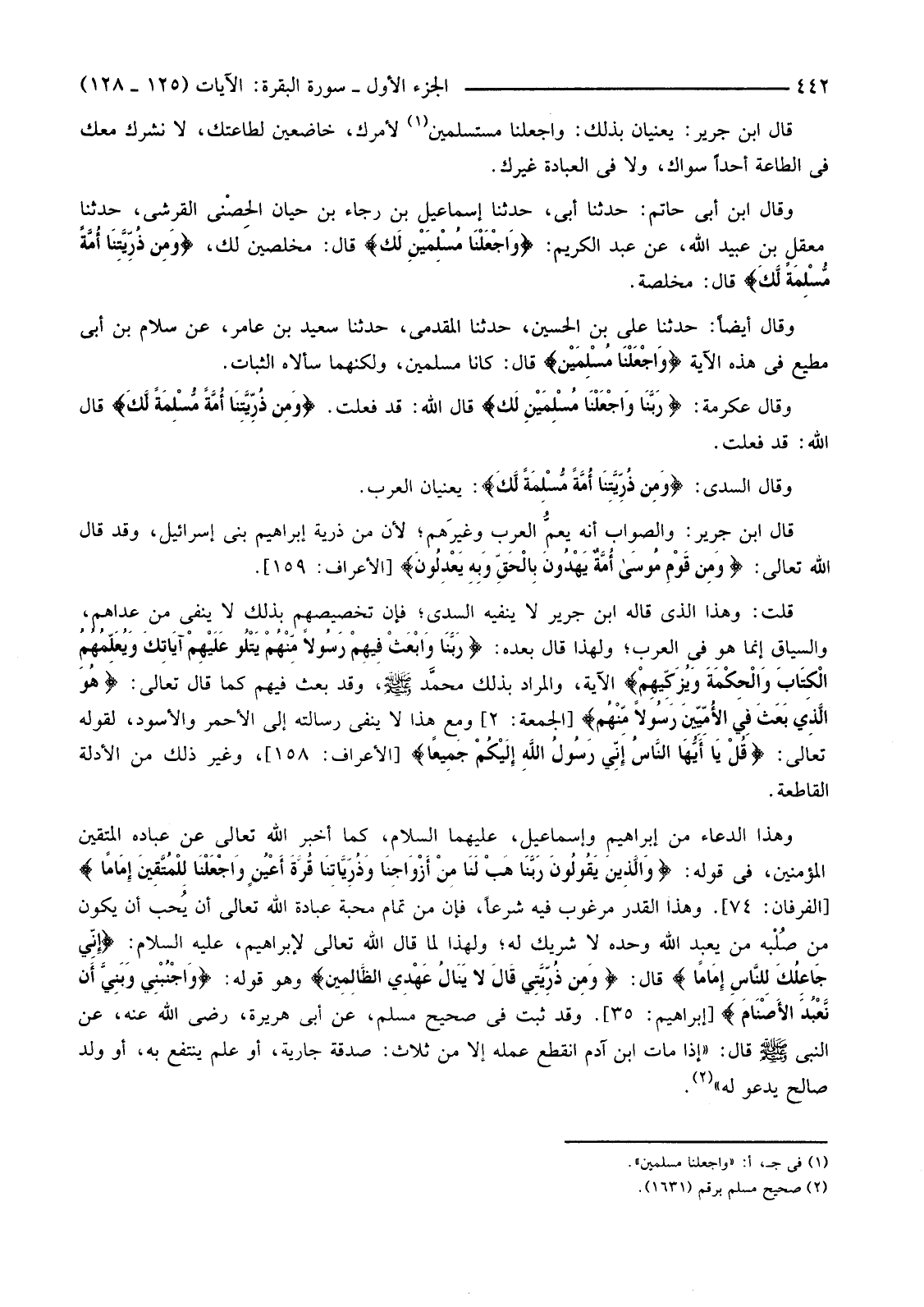 وَهَذَا الدُّعَاءُ مِنْ إِبْرَاهِيمَ وَإِسْمَاعِيلَ، عَلَيْهِمَا السَّلَامُ، كَمَا أَخْبَرَ اللَّهُ تَعَالَى عَنْ عِبَادِهِ الْمُتَّقِينَ الْمُؤْمِنِينَ، فِي قَوْلِهِ: {وَالَّذِينَ يَقُولُونَ رَبَّنَا هَبْ لَنَا مِنْ أَزْوَاجِنَا وَذُرِّيَّاتِنَا قُرَّةَ أَعْيُنٍ وَاجْعَلْنَا لِلْمُتَّقِينَ إِمَامًا} [الْفُرْقَانِ: 74] . وَهَذَا الْقَدْرُ مَرْغُوبٌ فِيهِ شَرْعًا، فَإِنَّ مِنْ تَمَامِ مَحَبَّةِ عِبَادَةِ اللَّهِ تَعَالَى أَنْ يُحِبَّ أَنْ يَكُونَ مِنْ صُلْبِهِ مَنْ يَعْبُدُ اللَّهَ وَحْدَهُ لَا شَرِيكَ لَهُ؛ وَلِهَذَا لَمَّا قَالَ اللَّهُ تَعَالَى لِإِبْرَاهِيمَ، عَلَيْهِ السَّلَامُ: {إِنِّي جَاعِلُكَ لِلنَّاسِ إِمَامًا} قَالَ: {وَمِنْ ذُرِّيَّتِي قَالَ لَا يَنَالُ عَهْدِي الظَّالِمِينَ} وَهُوَ قَوْلُهُ: {وَاجْنُبْنِي وَبَنِيَّ أَنْ نَعْبُدَ الأصْنَامَ} [إِبْرَاهِيمَ: 35] . وَقَدْ ثَبَتَ فِي صَحِيحِ مُسْلِمٍ، عَنْ أَبِي هُرَيْرَةَ، رَضِيَ اللَّهُ عَنْهُ، عَنِ النَّبِيِّ صَلَّى اللَّهُ عَلَيْهِ وَسَلَّمَ أَنَّهُ قَالَ: "إِذَا مَاتَ ابْنُ آدَمَ انْقَطَعَ عَمَلُهُ إِلَّا مِنْ ثَلَاثٍ: صَدَقَةٍ جَارِيَةٍ، أَوْ عِلْمٍ يُنْتَفَعُ بِهِ، أَوْ وَلَدٍ صَالِحٍ يدعو له" (2)