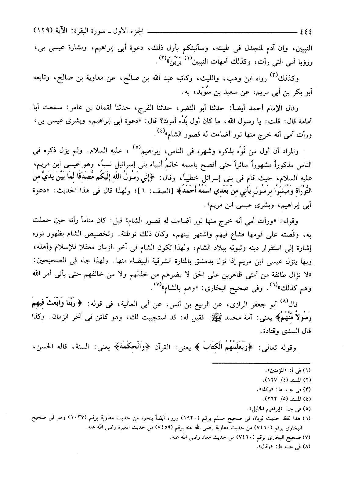 وَالْمُرَادُ أَنَّ أَوَّلَ مَنْ نَوّه بِذِكْرِهِ وَشَهَرَهُ فِي النَّاسِ، إِبْرَاهِيمُ (5) عَلَيْهِ السَّلَامُ. وَلَمْ يَزَلْ ذِكْرُهُ فِي النَّاسِ مَذْكُورًا مَشْهُورًا سَائِرًا حَتَّى أَفْصَحَ بِاسْمِهِ خاتمُ أَنْبِيَاءِ بَنِي إِسْرَائِيلَ نَسَبًا، وَهُوَ عِيسَى ابْنُ مَرْيَمَ، عَلَيْهِ السَّلَامُ، حَيْثُ قَامَ فِي بَنِي إِسْرَائِيلَ خَطِيبًا، وَقَالَ: {إِنِّي رَسُولُ اللَّهِ إِلَيْكُمْ مُصَدِّقًا لِمَا بَيْنَ يَدَيَّ مِنَ التَّوْرَاةِ وَمُبَشِّرًا بِرَسُولٍ يَأْتِي مِنْ بَعْدِي اسْمُهُ أَحْمَدُ} [الصَّفِّ: 6] ؛ وَلِهَذَا قَالَ فِي هَذَا الحديث: "دعوة أبي إبراهيم، وبشرى عيسى بن مَرْيَمَ".
