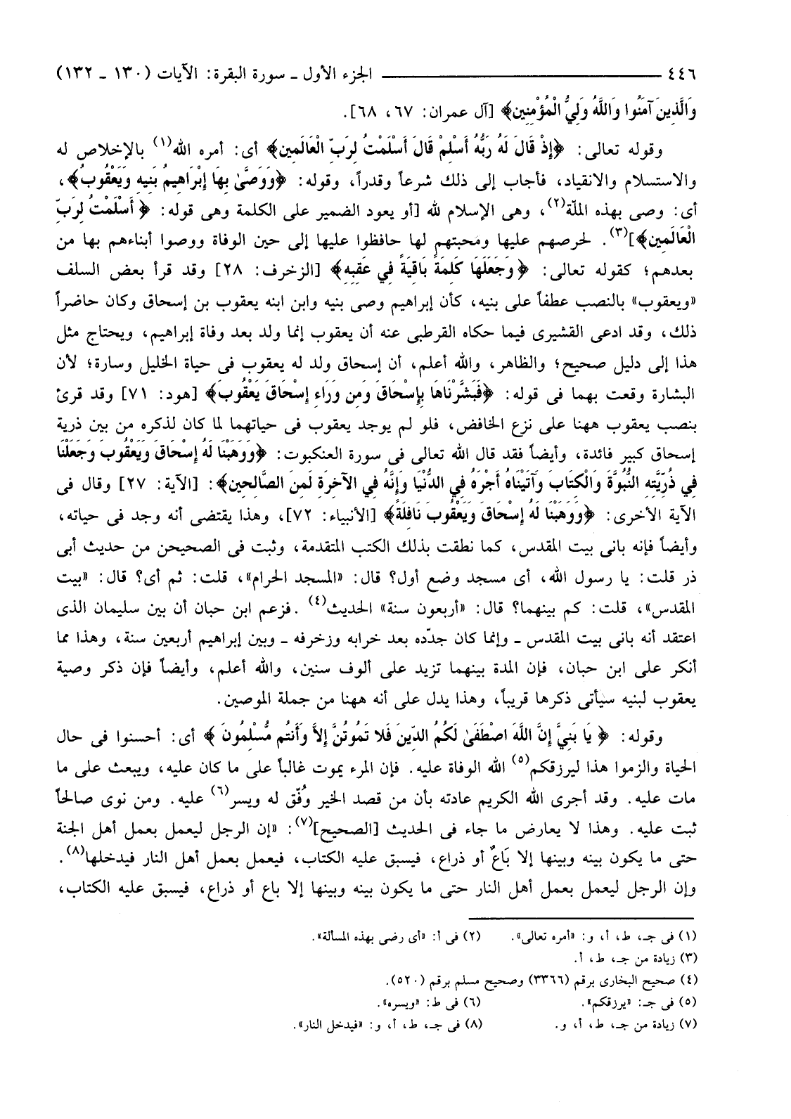 وَقَوْلُهُ: {وَوَصَّى بِهَا إِبْرَاهِيمُ بَنِيهِ وَيَعْقُوبُ} أَيْ: وَصَّى بِهَذِهِ الْمِلَّةِ (2) وَهِيَ الْإِسْلَامُ لِلَّهِ [أَوْ يَعُودُ الضَّمِيرُ عَلَى الْكَلِمَةِ وَهِيَ قَوْلُهُ: {أَسْلَمْتُ لِرَبِّ الْعَالَمِينَ} ] (3) . لِحِرْصِهِمْ عَلَيْهَا وَمَحَبَّتِهِمْ لَهَا حَافَظُوا عَلَيْهَا إِلَى حِينِ الْوَفَاةِ وَوَصَّوْا أَبْنَاءَهُمْ بِهَا مِنْ بَعْدِهِمْ؛ كَقَوْلِهِ تَعَالَى: {وَجَعَلَهَا كَلِمَةً بَاقِيَةً فِي عَقِبِهِ} [الزُّخْرُفِ: 28] وَقَدْ قَرَأَ بَعْضُ السَّلَفِ "وَيَعْقُوبَ" بِالنَّصْبِ عَطْفًا عَلَى بَنِيهِ، كَأَنَّ إِبْرَاهِيمَ وَصَّى بَنِيهِ وَابْنَ ابْنِهِ يَعْقُوبَ بْنَ إِسْحَاقَ وَكَانَ حَاضِرًا ذَلِكَ، وَقَدِ ادَّعَى الْقُشَيْرِيُّ، فِيمَا حَكَاهُ الْقُرْطُبِيُّ عَنْهُ أَنَّ يَعْقُوبَ إِنَّمَا وُلِدَ بَعْدَ وَفَاةِ إِبْرَاهِيمَ، وَيَحْتَاجُ مِثْلُ هَذَا إِلَى دَلِيلٍ صَحِيحٍ؛ وَالظَّاهِرُ، وَاللَّهُ أَعْلَمُ، أَنَّ إِسْحَاقَ وُلِدَ لَهُ يَعْقُوبُ فِي حَيَاةِ الْخَلِيلِ وَسَارَّةُ؛ لِأَنَّ الْبِشَارَةَ وَقَعَتْ بِهِمَا فِي قَوْلِهِ: {فَبَشَّرْنَاهَا بِإِسْحَاقَ وَمِنْ وَرَاءِ إِسْحَاقَ يَعْقُوبَ} [هُودٍ: 71] وَقَدْ قُرِئَ بِنَصْبِ يَعْقُوبَ هَاهُنَا عَلَى نَزْعِ الْخَافِضِ، فَلَوْ لَمْ يُوجَدْ يَعْقُوبُ فِي حَيَاتِهِمَا لَمَا كَانَ لِذِكْرِهِ مِنْ بَيْنِ ذَرِّيَّةِ إِسْحَاقَ كَبِيرُ فَائِدَةٍ، وَأَيْضًا فَقَدْ قَالَ اللَّهُ تَعَالَى فِي سُورَةِ الْعَنْكَبُوتِ: {وَوَهَبْنَا لَهُ إِسْحَاقَ وَيَعْقُوبَ وَجَعَلْنَا فِي ذُرِّيَّتِهِ النُّبُوَّةَ وَالْكِتَابَ وَآتَيْنَاهُ أَجْرَهُ فِي الدُّنْيَا وَإِنَّهُ فِي الآخِرَةِ لَمِنَ الصَّالِحِينَ} [الْآيَةَ: 27] وَقَالَ فِي الْآيَةِ الْأُخْرَى: {وَوَهَبْنَا لَهُ إِسْحَاقَ وَيَعْقُوبَ نَافِلَةً} [الْأَنْبِيَاءِ: 72] وَهَذَا يَقْتَضِي أَنَّهُ وُجِدَ فِي حَيَاتِهِ، وَأَيْضًا فَإِنَّهُ بَانِي بَيْتَ الْمَقْدِسِ، كَمَا نَطَقَتْ بِذَلِكَ الْكُتُبُ الْمُتَقَدِّمَةُ، وَثَبَتَ فِي الصَّحِيحَيْنِ مِنْ حَدِيثِ أَبِي ذَرٍّ قُلْتُ: يَا رَسُولَ اللَّهِ، أَيُّ مَسْجِدٍ وُضِعَ أَوَّلُ؟ قَالَ: "الْمَسْجِدُ الْحَرَامُ"، قُلْتُ: ثُمَّ أَيُّ؟ قَالَ: "بَيْتُ الْمَقْدِسِ". قُلْتُ: كَمْ بَيْنَهُمَا؟ قَالَ: "أَرْبَعُونَ سَنَةً" الْحَدِيثَ (4) . فَزَعَمَ ابْنُ حِبَّانَ أَنَّ بَيْنَ سُلَيْمَانَ الذِي اعْتَقَدَ أَنَّهُ بَانِي بَيْتَ الْمَقْدِسِ -وَإِنَّمَا كَانَ جَدَّدَهُ بَعْدَ خَرَابِهِ وَزَخْرَفَهُ -وَبَيْنَ إِبْرَاهِيمَ أَرْبَعِينَ سَنَةً، وَهَذَا مِمَّا أُنْكِرَ عَلَى ابْنِ حِبَّانَ، فَإِنَّ الْمُدَّةَ بَيْنَهُمَا تَزِيدُ عَلَى أُلُوفِ سِنِينَ، وَاللَّهُ أَعْلَمُ، وَأَيْضًا فَإِنَّ ذِكْرَ وَصِيَّةِ يَعْقُوبَ لِبَنِيهِ سَيَأْتِي ذِكْرُهَا قَرِيبًا، وَهَذَا يَدُلُّ عَلَى أَنَّهُ هَاهُنَا مِنْ جُمْلَةِ الْمُوصِينَ.