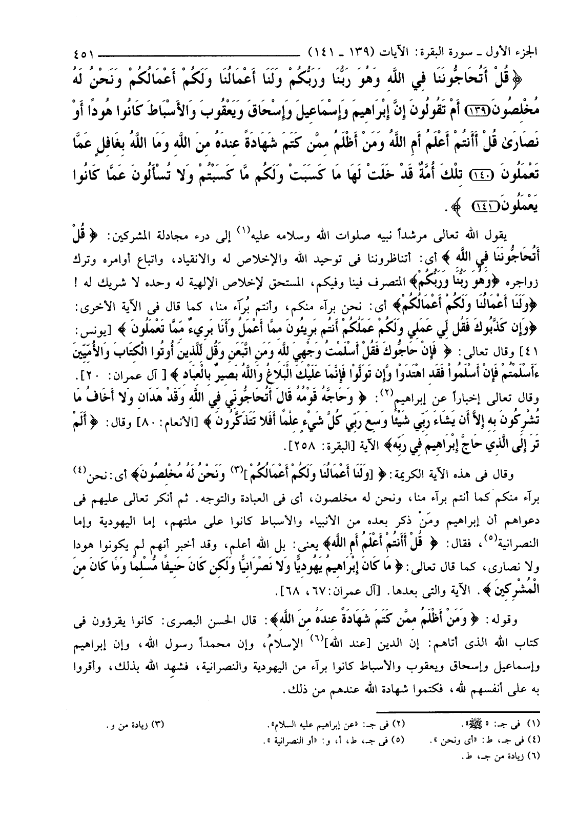 {قُلْ أَتُحَاجُّونَنَا فِي اللَّهِ وَهُوَ رَبُّنَا وَرَبُّكُمْ وَلَنَا أَعْمَالُنَا وَلَكُمْ أَعْمَالُكُمْ وَنَحْنُ لَهُ مُخْلِصُونَ (139) أَمْ تَقُولُونَ إِنَّ إِبْرَاهِيمَ وَإِسْمَاعِيلَ وَإِسْحَاقَ وَيَعْقُوبَ وَالأسْبَاطَ كَانُوا هُودًا أَوْ نَصَارَى قُلْ أَأَنْتُمْ أَعْلَمُ أَمِ اللَّهُ وَمَنْ أَظْلَمُ مِمَّنْ كَتَمَ شَهَادَةً عِنْدَهُ مِنَ اللَّهِ وَمَا اللَّهُ بِغَافِلٍ عَمَّا تَعْمَلُونَ (140) تِلْكَ أُمَّةٌ قَدْ خَلَتْ لَهَا مَا كَسَبَتْ وَلَكُمْ مَا كَسَبْتُمْ وَلا تُسْأَلُونَ عَمَّا كَانُوا يَعْمَلُونَ (141) }