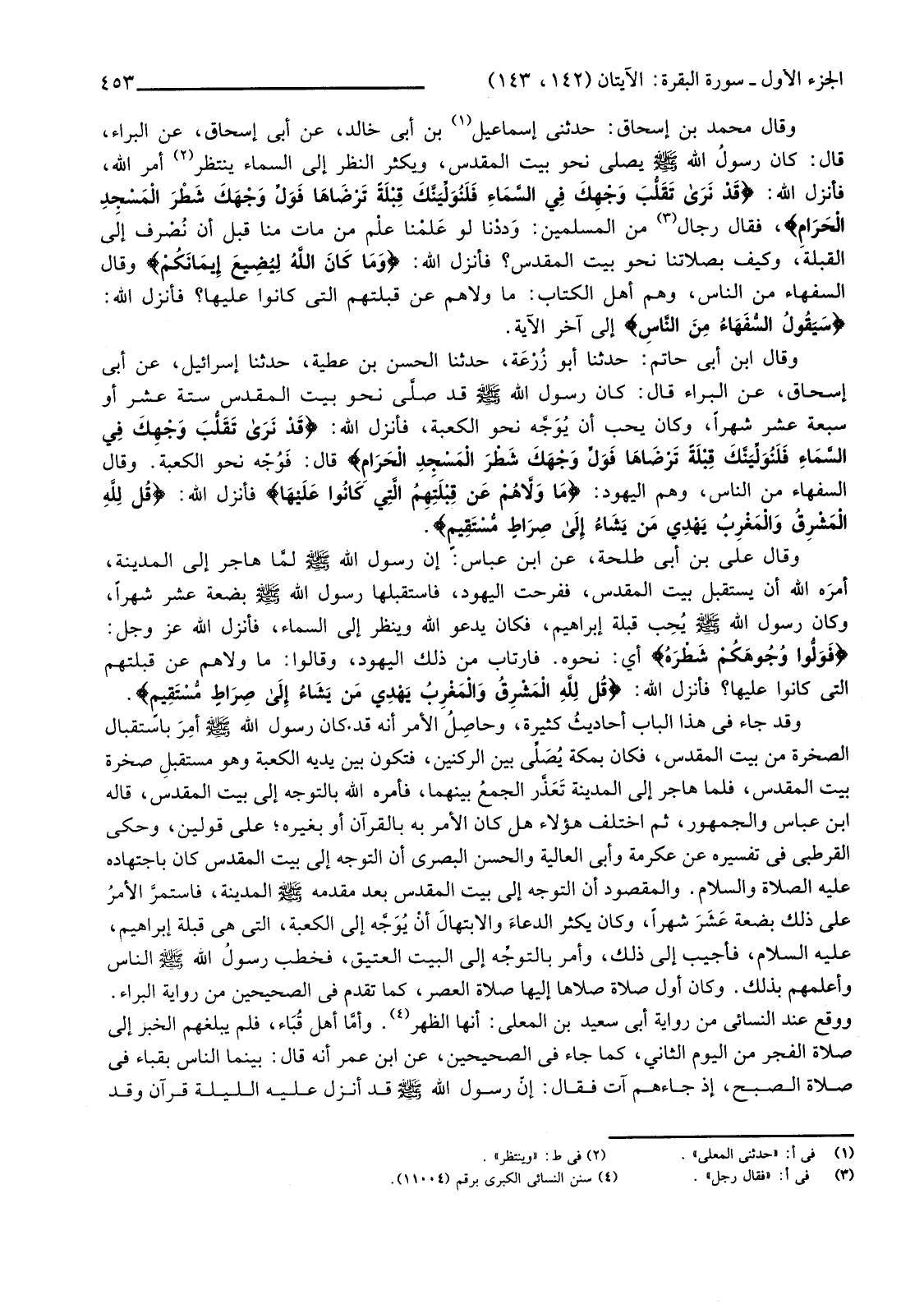 وَقَالَ مُحَمَّدُ بْنُ إِسْحَاقَ: حَدَّثَنِي إِسْمَاعِيلُ (1) بْنُ أَبِي خَالِدٍ، عَنْ أَبِي إِسْحَاقَ، عَنِ الْبَرَاءِ، قَالَ: كَانَ رَسُولُ اللَّهِ صَلَّى اللَّهُ عَلَيْهِ وَسَلَّمَ يُصَلِّي نَحْوَ بَيْتِ الْمَقْدِسِ، وَيُكْثِرُ النَّظَرَ إِلَى السَّمَاءِ يَنْتَظِرُ (2) أَمْرَ اللَّهِ، فَأَنْزَلَ اللَّهُ: {قَدْ نَرَى تَقَلُّبَ وَجْهِكَ فِي السَّمَاءِ فَلَنُوَلِّيَنَّكَ قِبْلَةً تَرْضَاهَا فَوَلِّ وَجْهَكَ شَطْرَ الْمَسْجِدِ الْحَرَامِ} فَقَالَ رِجَالٌ (3) مِنَ الْمُسْلِمِينَ: وَددْنا لَوْ عَلمْنا عِلْمَ مَنْ مَاتَ مِنَّا قَبْلَ أَنْ نُصْرف إِلَى الْقِبْلَةِ، وَكَيْفَ بِصَلَاتِنَا نَحْوَ بَيْتِ الْمَقْدِسِ؟ فَأَنْزَلَ اللَّهُ: {وَمَا كَانَ اللَّهُ لِيُضِيعَ إِيمَانَكُمْ} وَقَالَ السُّفَهَاءُ مِنَ النَّاسِ، وَهُمْ أَهْلُ الْكِتَابِ: ما ولاهم عن قبلتهم التي كانوا عليها؟ فَأَنْزَلَ اللَّهُ: {سَيَقُولُ السُّفَهَاءُ مِنَ النَّاسِ} إِلَى آخِرِ الْآيَةِ.