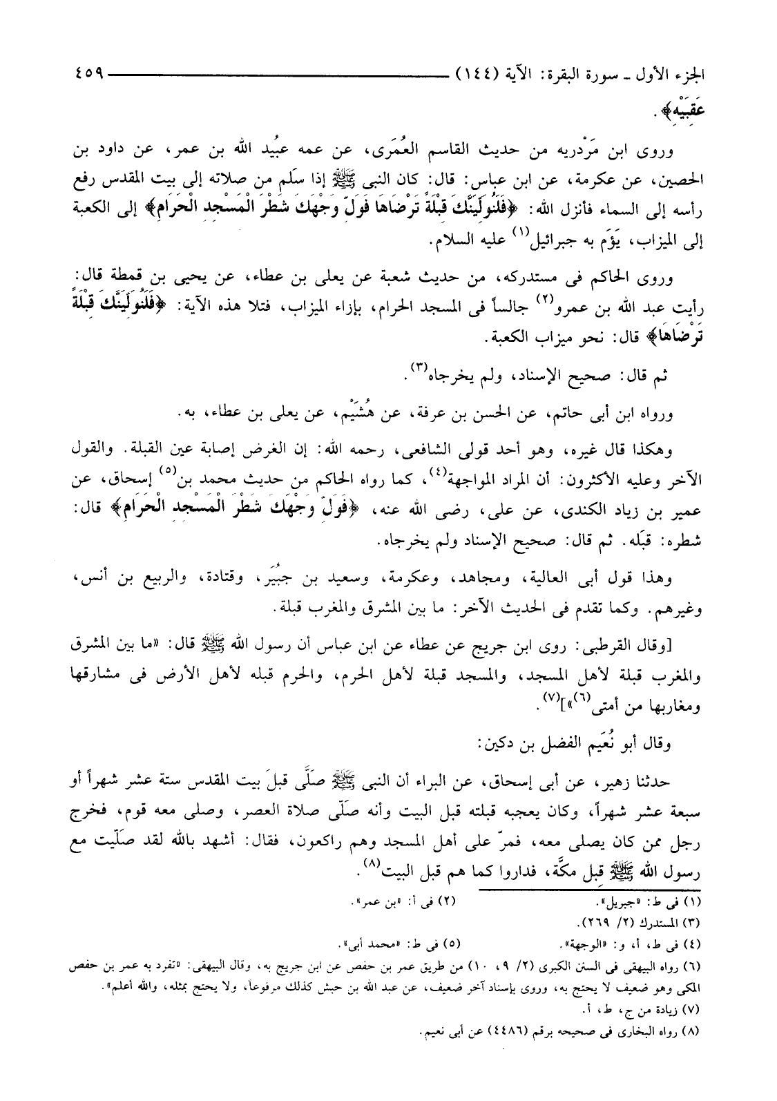 وَهَكَذَا قَالَ غَيْرُهُ، وَهُوَ أَحَدُ قَوْلَيِ الشَّافِعِيِّ، رَحِمَهُ اللَّهُ: إِنَّ الْغَرَضَ إِصَابَةُ عَيْنِ الْقِبْلَةِ. وَالْقَوْلُ الْآخَرُ وَعَلَيْهِ الْأَكْثَرُونَ: أَنَّ الْمُرَادَ الْمُوَاجَهَةَ (4) كَمَا رَوَاهُ الْحَاكِمُ مِنْ حَدِيثِ مُحَمَّدِ بْنِ (5) إِسْحَاقَ، عَنْ عُمَيْرِ بْنِ زِيَادٍ الْكِنْدِيِّ، عَنْ عَلِيٍّ، رَضِيَ اللَّهُ عَنْهُ، {فَوَلِّ وَجْهَكَ شَطْرَ الْمَسْجِدِ الْحَرَامِ} قَالَ: شَطْرَهُ: قِبَلَهُ. ثُمَّ قَالَ: صَحِيحُ الْإِسْنَادِ وَلَمْ يُخَرِّجَاهُ.