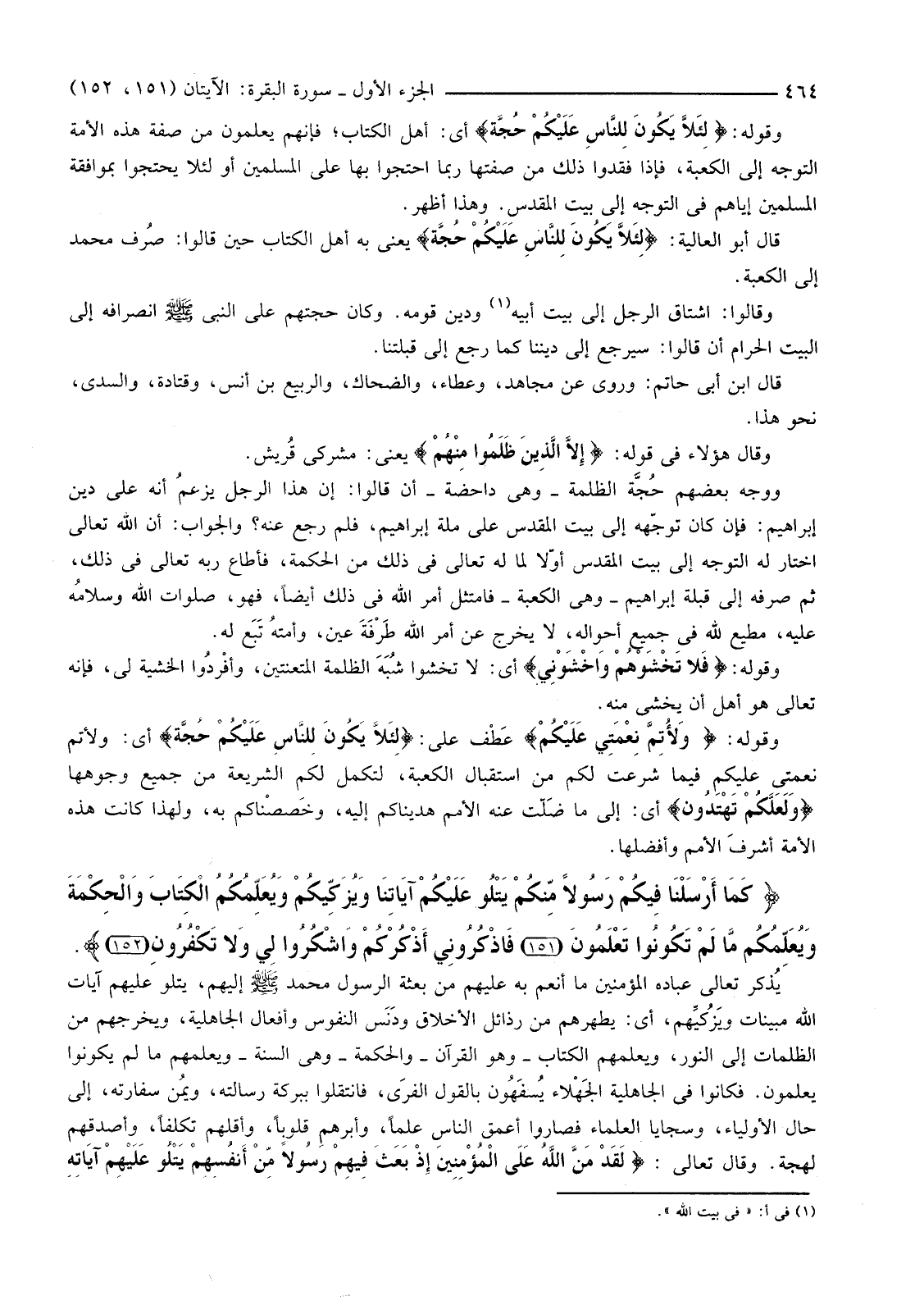 قَالَ أَبُو الْعَالِيَةِ: {لِئَلا يَكُونَ لِلنَّاسِ عَلَيْكُمْ حُجَّةٌ} يَعْنِي بِهِ أَهْلَ الْكِتَابِ حِينَ قَالُوا: صُرف مُحَمَّدٌ إِلَى الْكَعْبَةِ.