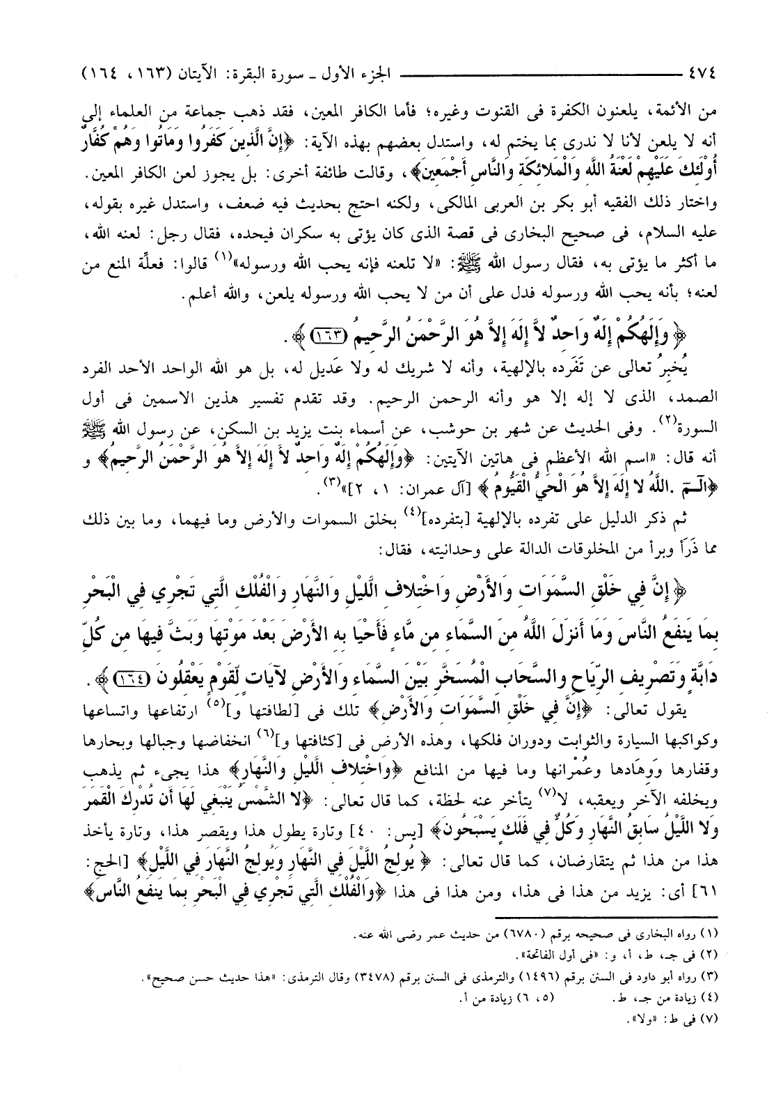 يُخبرُ تَعَالَى عَنْ تَفَرُّدِهِ بِالْإِلَهِيَّةِ، وَأَنَّهُ لَا شَرِيكَ لَهُ وَلَا عَديل لَهُ، بَلْ هُوَ اللَّهُ الْوَاحِدُ الْأَحَدُ الْفَرْدُ الصَّمَدُ، الذِي لَا إِلَهَ إِلَّا هُوَ وَأَنَّهُ الرَّحْمَنُ الرَّحِيمُ. وَقَدْ تَقَدَّمَ تَفْسِيرُ هَذَيْنَ الِاسْمَيْنِ فِي أَوَّلِ السُّورَةِ (2) . وَفِي الْحَدِيثِ عَنْ شَهْرِ بْنِ حَوْشَبٍ، عَنْ أَسْمَاءَ بِنْتِ يزيد بْنِ السَّكَنِ، عَنْ رَسُولِ اللَّهِ صَلَّى اللَّهُ عَلَيْهِ وَسَلَّمَ أَنَّهُ قَالَ: "اسْمُ اللَّهِ الْأَعْظَمُ فِي هَاتَيْنِ الْآيَتَيْنِ: {وَإِلَهُكُمْ إِلَهٌ وَاحِدٌ لَا إِلَهَ إِلا هُوَ الرَّحْمَنُ الرَّحِيمُ} وَ {الم * اللَّهُ لَا إِلَهَ إِلا هُوَ الْحَيُّ الْقَيُّومُ} [آل عمران: 1، 2] " (3)