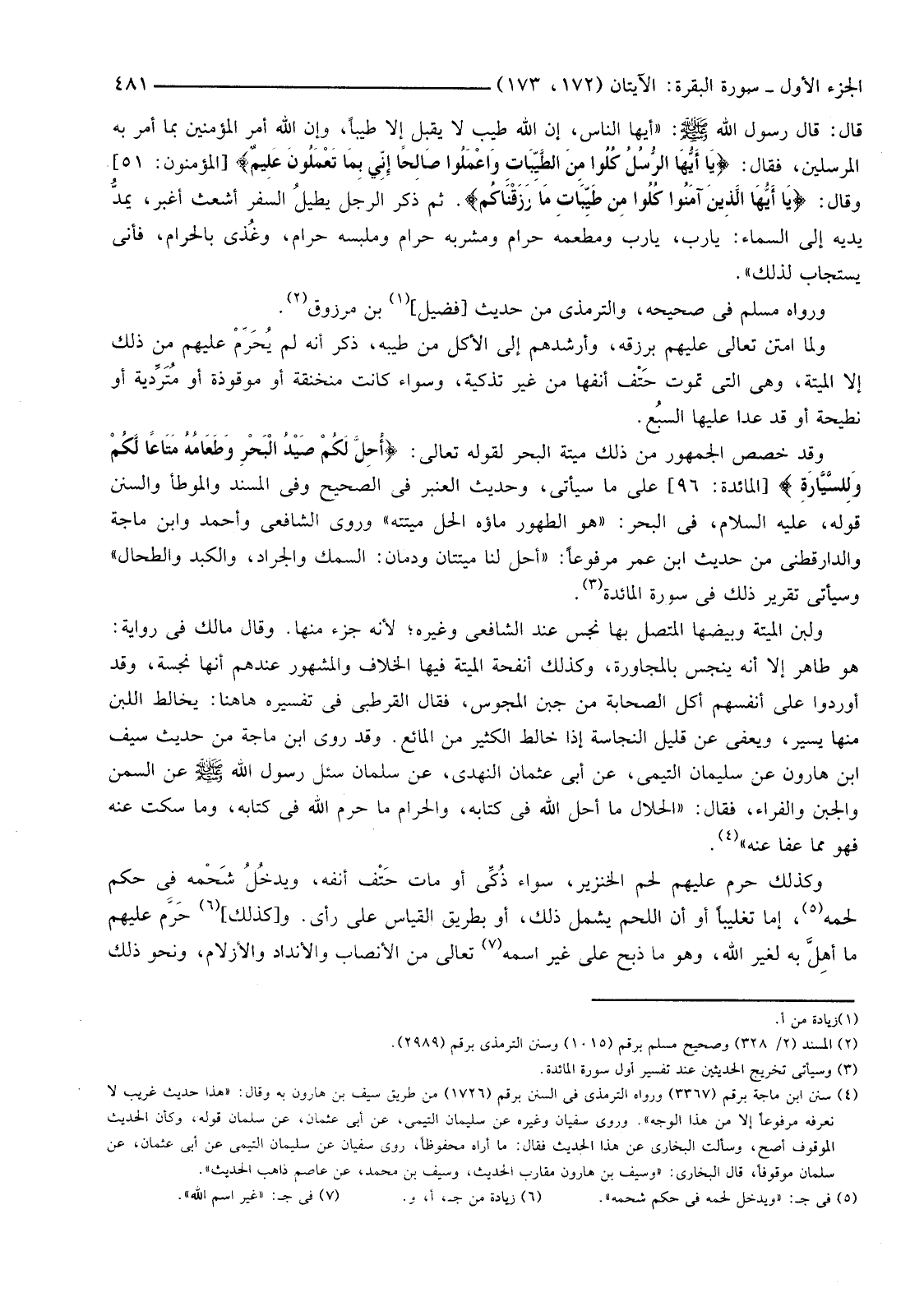 وَقَدْ خَصَّصَ الْجُمْهُورُ مِنْ ذَلِكَ مَيْتَةَ الْبَحْرِ لِقَوْلِهِ تَعَالَى: {أُحِلَّ لَكُمْ صَيْدُ الْبَحْرِ وَطَعَامُهُ مَتَاعًا لَكُمْ وَلِلسَّيَّارَةِ} [الْمَائِدَةِ: 96] عَلَى مَا سَيَأْتِي، وَحَدِيثُ الْعَنْبَرِ فِي الصَّحِيحِ وَفِي الْمُسْنَدِ وَالْمُوَطَّأِ وَالسُّنَنِ قَوْلُهُ، عَلَيْهِ السَّلَامُ، فِي الْبَحْرِ: "هُوَ الطَّهُورُ مَاؤُهُ الْحِلُّ مَيْتَتُهُ" وَرَوَى الشَّافِعِيُّ وَأَحْمَدُ وَابْنُ مَاجَهْ وَالدَّارَقُطْنِيُّ مِنْ حَدِيثِ ابْنِ عُمَرَ مَرْفُوعًا: "أُحِلَّ لَنَا مَيْتَتَانِ وَدَمَانِ: السَّمَكُ وَالْجَرَادُ، وَالْكَبِدُ وَالطِّحَالُ" وَسَيَأْتِي تَقْرِيرُ ذَلِكَ فِي سُورَةِ الْمَائِدَةِ (3) .