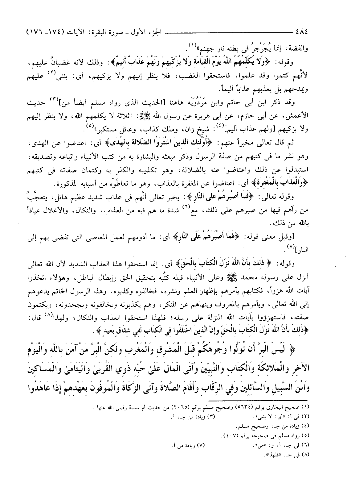 وَقَوْلُهُ: {وَلا يُكَلِّمُهُمُ اللَّهُ يَوْمَ الْقِيَامَةِ وَلا يُزَكِّيهِمْ وَلَهُمْ عَذَابٌ أَلِيمٌ} وَذَلِكَ لِأَنَّهُ غضبانُ عَلَيْهِمْ، لِأَنَّهُمْ كَتَمُوا وَقَدْ عَلِمُوا، فَاسْتَحَقُّوا الْغَضَبَ، فَلَا يَنْظُرُ إِلَيْهِمْ وَلَا يُزَكِّيهِمْ، أَيْ يُثْنِي (2) عَلَيْهِمْ وَيَمْدَحُهُمْ بَلْ يُعَذِّبُهُمْ عَذَابًا أَلِيمًا.