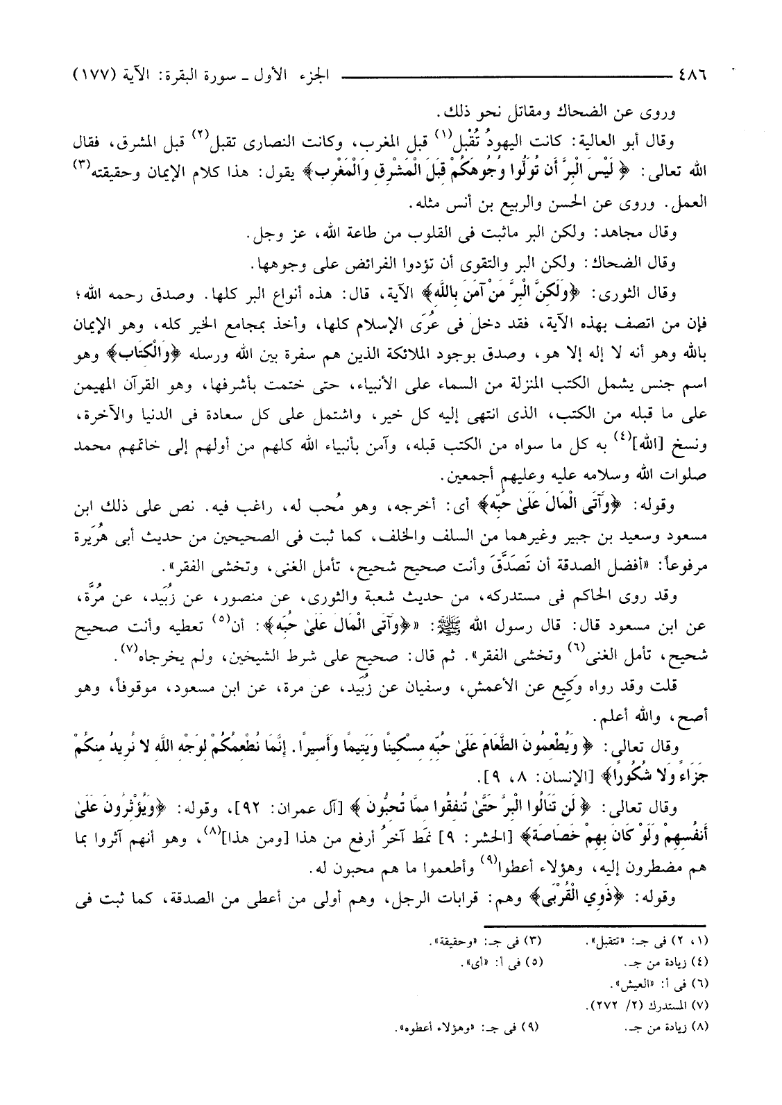 وَقَدْ رَوَى الْحَاكِمُ فِي مُسْتَدْرَكِهِ، مِنْ حَدِيثِ شُعْبَةَ وَالثَّوْرِيِّ، عَنْ مَنْصُورٍ، عَنْ زُبَيد، عَنْ مُرَّة، عَنِ ابْنِ مَسْعُودٍ قَالَ: قَالَ رَسُولُ اللَّهِ صَلَّى اللَّهُ عَلَيْهِ وَسَلَّمَ: {وَآتَى الْمَالَ عَلَى حُبِّهِ} أَنْ (5) تُعْطِيَهُ وَأَنْتَ صَحِيحٌ شَحِيحٌ، تَأْمُلُ الْغِنَى (6) وَتَخْشَى الْفَقْرَ". ثُمَّ قَالَ: صَحِيحٌ عَلَى شَرْطِ الشَّيْخَيْنِ، وَلَمْ يُخَرِّجَاهُ (7) .
