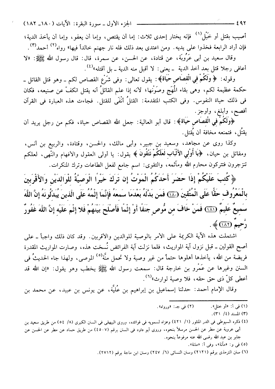 اشْتَمَلَتْ هَذِهِ الْآيَةُ الْكَرِيمَةُ عَلَى الْأَمْرِ بِالْوَصِيَّةِ لِلْوَالِدَيْنِ وَالْأَقْرَبِينَ. وَقَدْ كَانَ ذَلِكَ وَاجِبًا -عَلَى أَصَحِّ الْقَوْلَيْنِ -قَبْلَ نُزُولِ آيَةِ الْمَوَارِيثِ، فَلَمَّا نَزَلَتْ آيَةُ الْفَرَائِضِ نَسَخَتْ هَذِهِ، وَصَارَتِ الْمَوَارِيثُ الْمُقَدَّرَةُ فَرِيضَةً مِنَ اللَّهِ، يَأْخُذُهَا أَهْلُوهَا حَتْمًا مِنْ غَيْرِ وَصِيَّةٍ وَلَا تَحْمِلُ منَّة (1) الْمُوصِي، وَلِهَذَا جَاءَ الْحَدِيثُ فِي السُّنَنِ وَغَيْرِهَا عَنْ عَمْرو بْنِ خَارِجَةَ قَالَ: سَمِعْتُ رَسُولَ اللَّهِ صَلَّى اللَّهُ عَلَيْهِ وَسَلَّمَ يَخْطُبُ وَهُوَ يَقُولُ: "إِنِ اللَّهَ قَدْ أَعْطَى كُلَّ ذِي حَقٍّ حَقَّهُ، فَلَا وَصِيَّةَ لِوَارِثٍ" (2) .