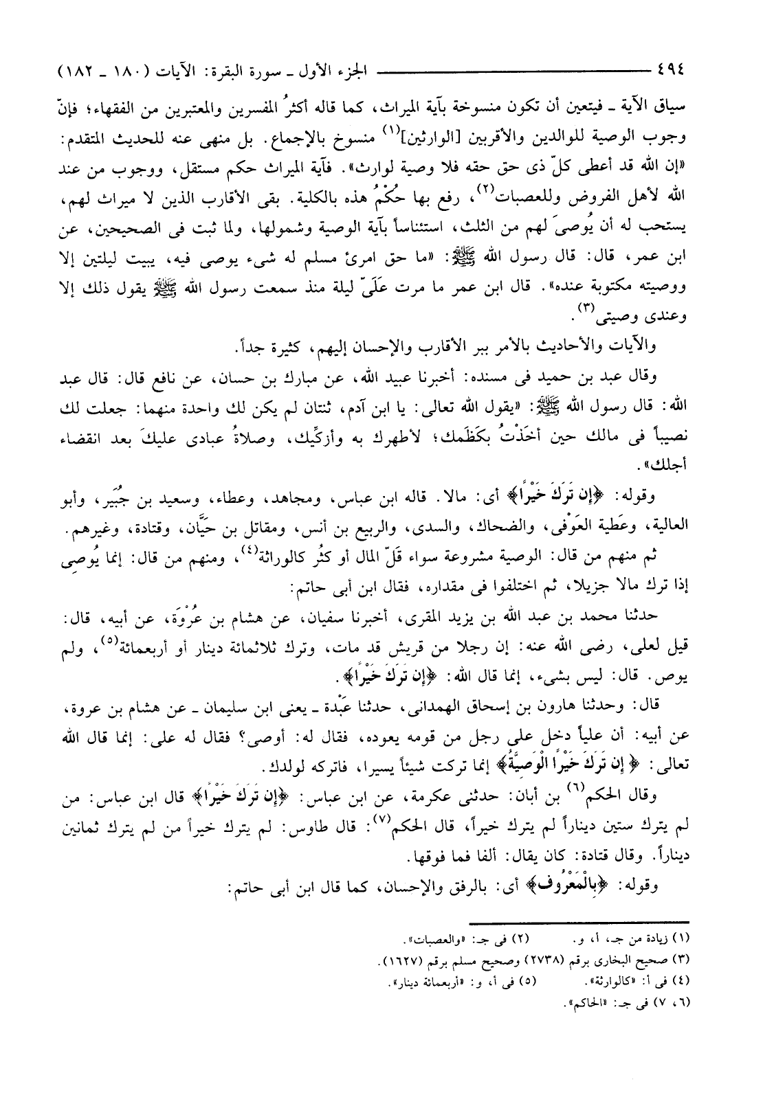 سِيَاقِ الْآيَةِ -فَيَتَعَيَّنُ أَنْ تَكُونَ مَنْسُوخَةً بِآيَةِ الْمِيرَاثِ، كَمَا قَالَهُ أَكْثَرُ الْمُفَسِّرِينَ وَالْمُعْتَبَرِينَ مِنَ الْفُقَهَاءِ؛ فَإِنَّ وُجُوبَ الْوَصِيَّةِ لِلْوَالِدَيْنِ وَالْأَقْرَبِينَ [الْوَارِثِينَ] (1) مَنْسُوخٌ بِالْإِجْمَاعِ. بَلْ مَنْهِيٌّ عَنْهُ لِلْحَدِيثِ الْمُتَقَدِّمِ: "إِنَّ اللَّهَ قَدْ أَعْطَى كُلَّ ذِي حَقٍّ حَقَّهُ فَلَا وَصِيَّةَ لِوَارِثٍ". فَآيَةُ الْمِيرَاثِ حُكْمٌ مُسْتَقِلٌّ، وَوُجُوبٌ مِنْ عِنْدِ اللَّهِ لِأَهْلِ الْفُرُوضِ وَلِلْعَصِبَاتِ (2) ، رَفَعَ بِهَا حُكْمَ هَذِهِ بِالْكُلِّيَّةِ. بَقِيَ الْأَقَارِبُ الَّذِينَ لَا مِيرَاثَ لَهُمْ، يُسْتَحَبُّ لَهُ أَنْ يُوصَى لَهُمْ مِنَ الثُّلُثِ، اسْتِئْنَاسًا بِآيَةِ الْوَصِيَّةِ وَشُمُولِهَا، وَلِمَا ثَبَتَ فِي الصَّحِيحَيْنِ، عَنِ ابْنِ عُمَرَ، قَالَ: قَالَ رَسُولُ اللَّهِ صَلَّى اللَّهُ عَلَيْهِ وَسَلَّمَ: "مَا حَقُّ امْرِئٍ مُسْلِمٍ لَهُ شَيْءٌ يُوصِي فِيهِ، يَبِيتُ لَيْلَتَيْنِ إِلَّا وَوَصِيَّتُهُ مَكْتُوبَةٌ عِنْدَهُ". قَالَ ابْنُ عُمَرَ مَا مَرَّتْ عَلَيّ لَيْلَةً مُنْذُ سَمِعْتُ رَسُولَ اللَّهِ صَلَّى اللَّهُ عَلَيْهِ وَسَلَّمَ يَقُولُ ذَلِكَ إِلَّا وَعِنْدِي وَصِيَّتِي (3) .