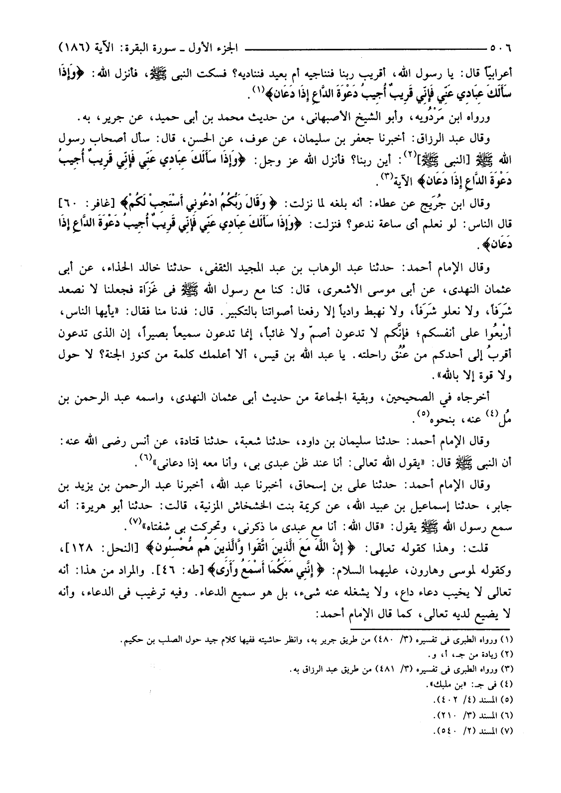 أَعْرَابِيًّا قَالَ: يَا رَسُولَ اللَّهِ، أَقَرِيبٌ رَبُّنَا فَنُنَاجِيهِ أَمْ بَعِيدٌ فَنُنَادِيهِ؟ فَسَكَتَ النَّبِيُّ صَلَّى اللَّهُ عَلَيْهِ وَسَلَّمَ، فَأَنْزَلَ اللَّهُ: {وَإِذَا سَأَلَكَ عِبَادِي عَنِّي فَإِنِّي قَرِيبٌ أُجِيبُ دَعْوَةَ الدَّاعِ إِذَا دَعَانِ} (1) .