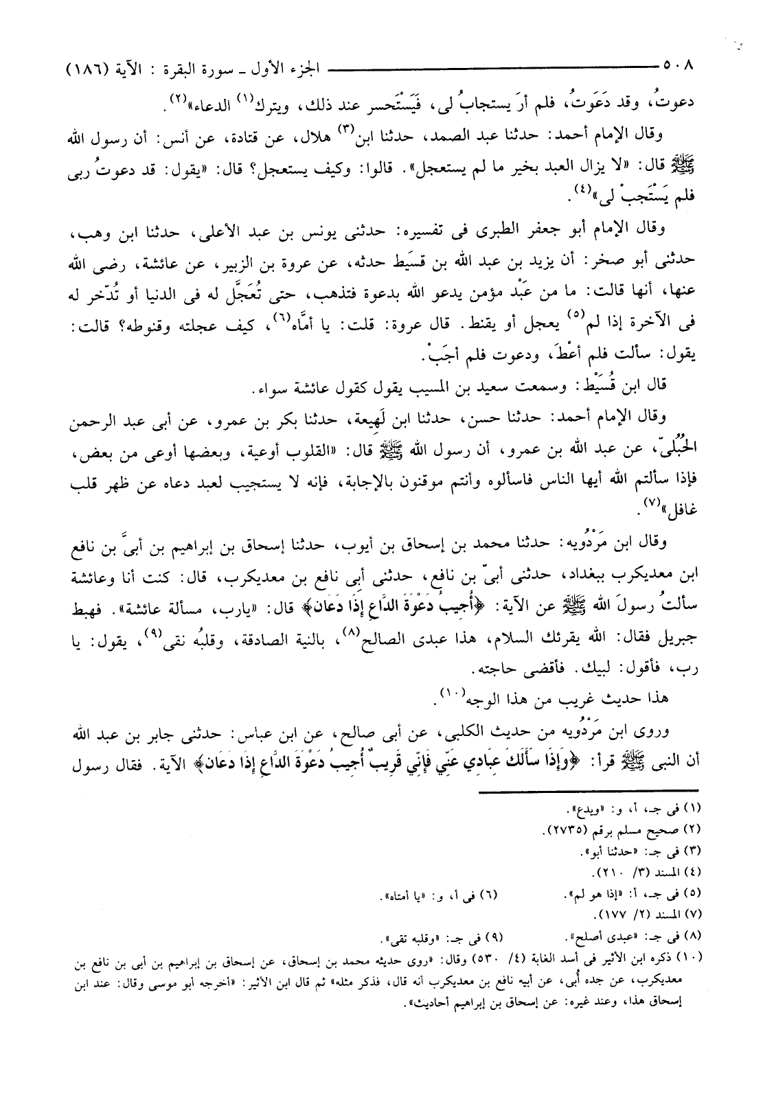 وَقَالَ الْإِمَامُ أَبُو جَعْفَرٍ الطَّبَرِيُّ فِي تَفْسِيرِهِ: حَدَّثَنِي يُونُسُ بْنُ عَبْدِ الْأَعْلَى، حَدَّثَنَا ابْنُ وَهْبٍ، حَدَّثَنِي أَبُو صَخْرٍ: أَنَّ يَزِيدَ بْنَ عَبْدِ اللَّهِ بْنِ قسَيط حَدَّثَهُ، عَنْ عُرْوَةَ بْنِ الزُّبَيْرِ، عَنْ عَائِشَةَ، رَضِيَ اللَّهُ عَنْهَا، أَنَّهَا قَالَتْ: مَا مِنْ عَبْد مُؤْمِنٍ يَدْعُو اللَّهَ بِدَعْوَةٍ فَتَذْهَبُ، حَتَّى تُعَجَّل لَهُ فِي الدُّنْيَا أَوْ تُدّخر لَهُ فِي الْآخِرَةِ، إِذَا لَمْ (5) يُعَجِّلْ أَوْ يَقْنَطْ. قَالَ عُرْوَةُ: قُلْتُ: يَا أمَّاه (6) كَيْفَ عَجَلَتُهُ وَقُنُوطُهُ؟ قَالَتْ: يَقُولُ: سَأَلْتُ فَلَمْ أعْطَ، وَدَعَوْتُ فَلَمْ أجَبْ.