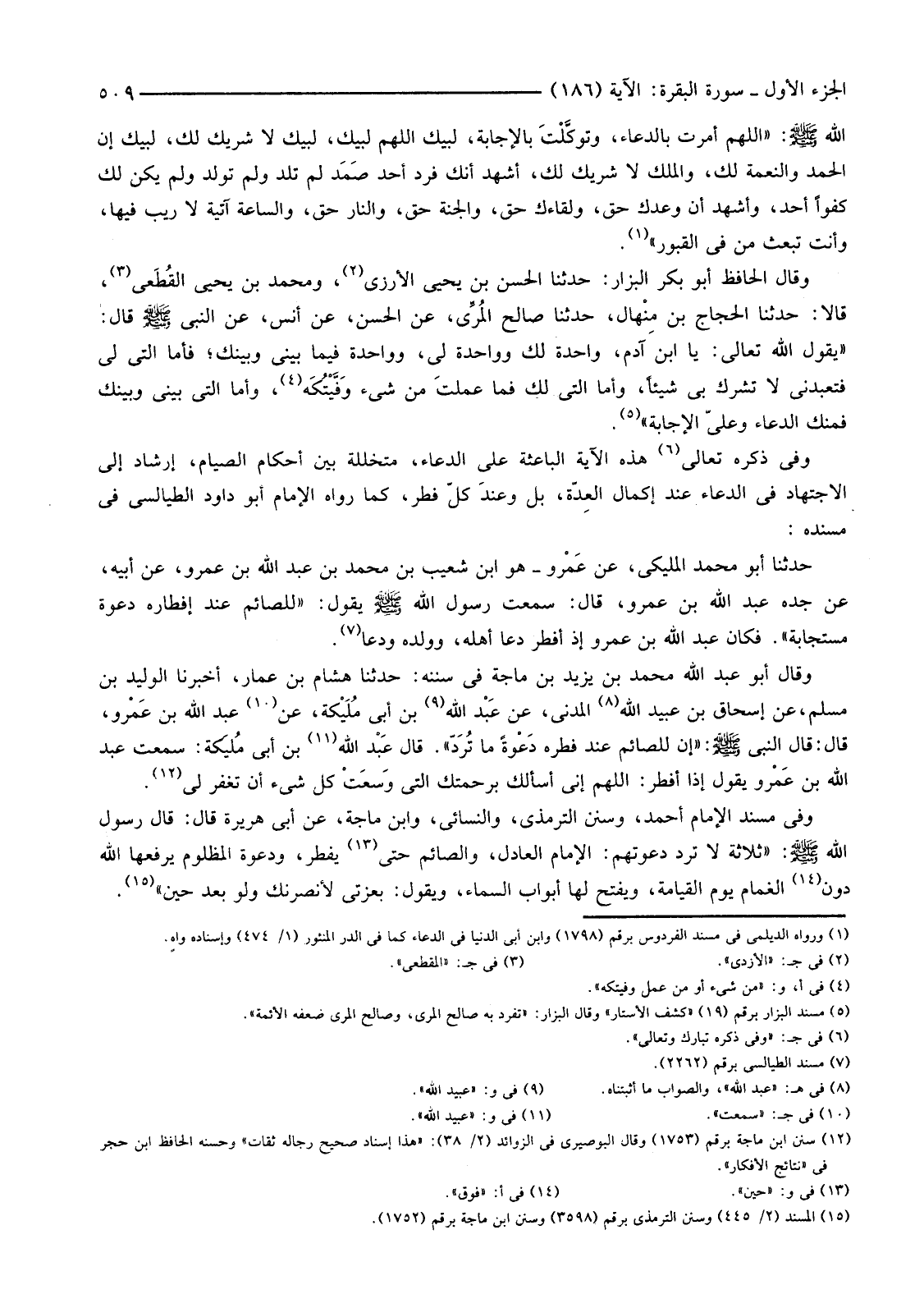 وَفِي ذِكْرِهِ تَعَالَى (6) هَذِهِ الْآيَةَ الْبَاعِثَةَ عَلَى الدُّعَاءِ، مُتَخَلِّلَةً بَيْنَ أَحْكَامِ الصِّيَامِ، إِرْشَادٌ إِلَى الِاجْتِهَادِ فِي الدُّعَاءِ عِنْدَ إِكْمَالِ العِدّة، بَلْ وعندَ كُلِّ فِطْرٍ، كَمَا رَوَاهُ الْإِمَامُ أَبُو دَاوُدَ الطَّيَالِسِيُّ فِي مُسْنَدِهِ: