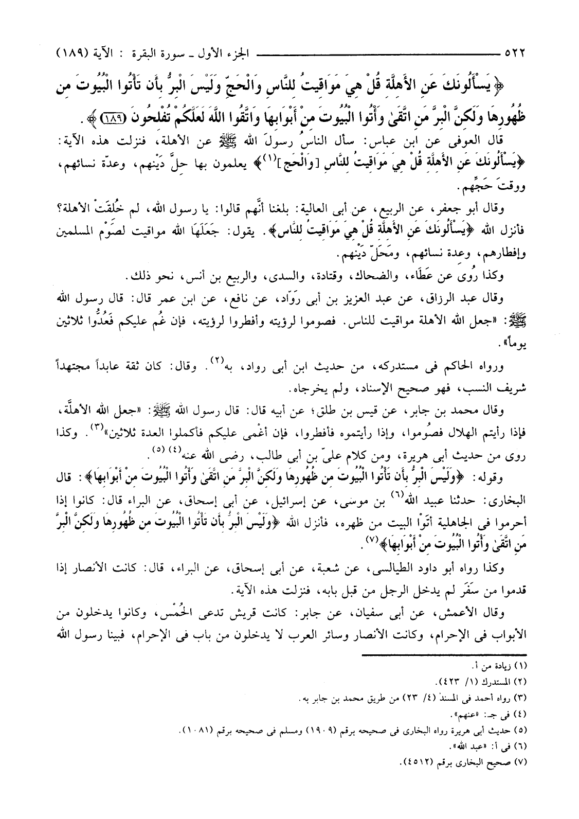 وَقَوْلُهُ: {وَلَيْسَ الْبِرُّ بِأَنْ تَأْتُوا الْبُيُوتَ مِنْ ظُهُورِهَا وَلَكِنَّ الْبِرَّ مَنِ اتَّقَى وَأْتُوا الْبُيُوتَ مِنْ أَبْوَابِهَا} قَالَ الْبُخَارِيُّ: حَدَّثَنَا عُبَيْدُ اللَّهِ (6) بْنُ مُوسَى، عَنْ إِسْرَائِيلَ، عَنْ أَبِي إِسْحَاقَ، عَنِ الْبَرَاءِ قَالَ: كَانُوا إِذَا أَحْرَمُوا فِي الْجَاهِلِيَّةِ أتَوْا الْبَيْتَ مِنْ ظَهْرِهِ، فَأَنْزَلَ اللَّهُ {وَلَيْسَ الْبِرُّ بِأَنْ تَأْتُوا الْبُيُوتَ مِنْ ظُهُورِهَا وَلَكِنَّ الْبِرَّ مَنِ اتَّقَى وَأْتُوا الْبُيُوتَ مِنْ أَبْوَابِهَا} (7) .