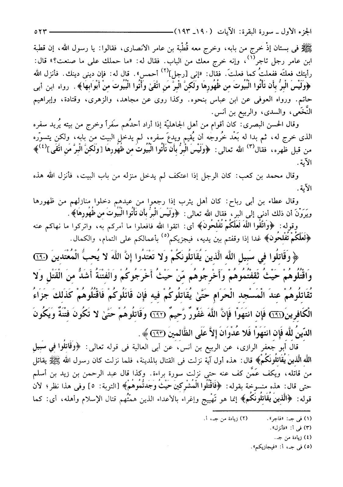 وَقَالَ الْحَسَنُ الْبَصْرِيُّ: كَانَ أَقْوَامٌ مِنْ أَهْلِ الْجَاهِلِيَّةِ إِذَا أَرَادَ أحدُهم سَفرًا وَخَرَجَ مَنْ بَيْتِهِ يُريد سَفَرَهُ الذِي خَرَجَ لَهُ، ثُمَّ بَدَا لَهُ بَعْد خُروجه أَنْ يُقيم ويدعَ سَفَرَهُ، لَمْ يَدْخُلِ الْبَيْتَ مِنْ بَابِهِ، وَلَكِنْ يَتَسَوَّرُهُ مِنْ قِبَلَ ظَهْرِهِ، فَقَالَ (3) اللَّهُ تَعَالَى: {وَلَيْسَ الْبِرُّ بِأَنْ تَأْتُوا الْبُيُوتَ مِنْ ظُهُورِهَا [وَلَكِنَّ الْبِرَّ مَنِ اتَّقَى] (4) } الْآيَةَ.