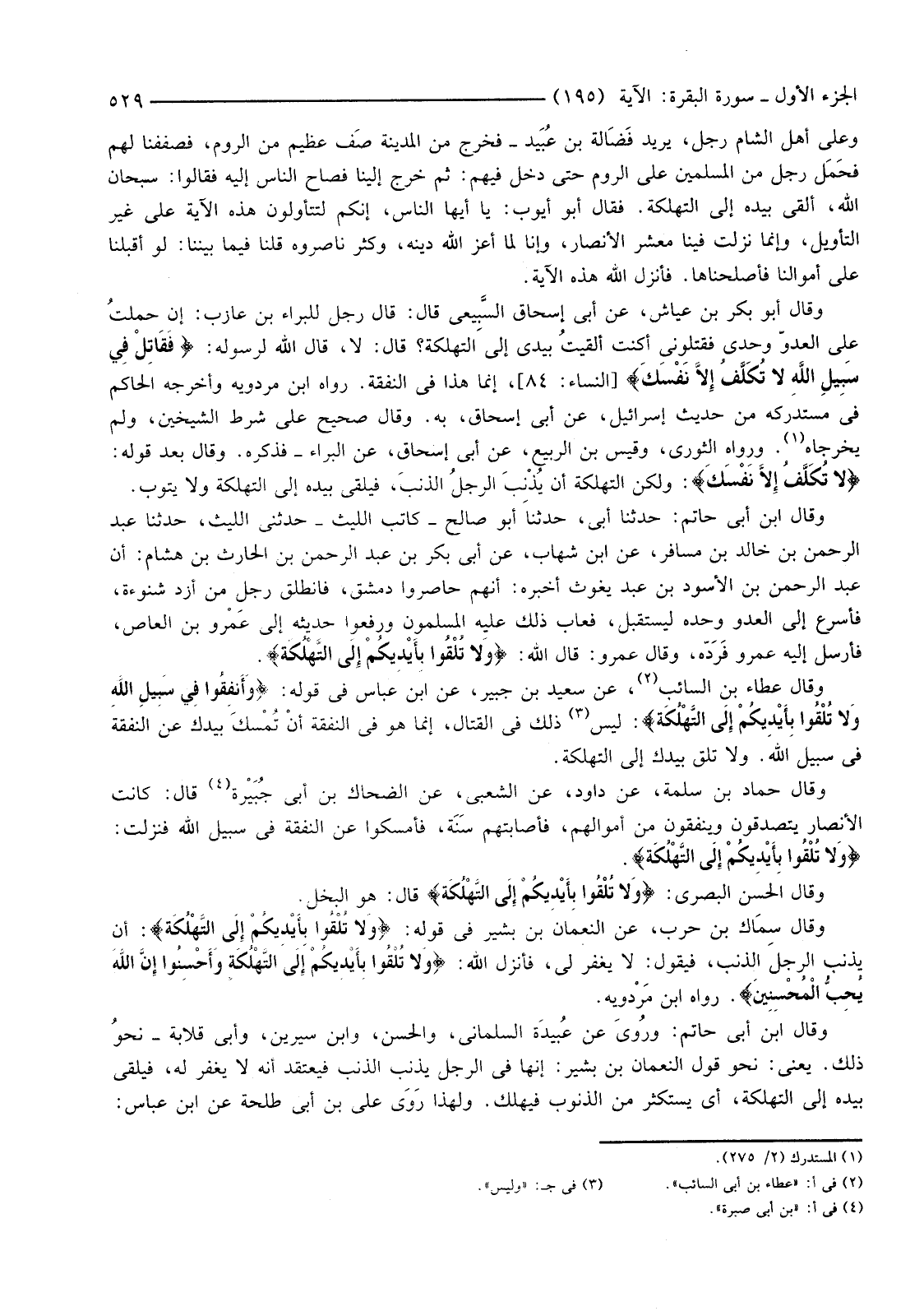 وَقَالَ ابْنُ أَبِي حَاتِمٍ: ورُويَ عَنْ عُبيدَة السَّلْمَانِيِّ، وَالْحَسَنِ، وَابْنِ سِيرِينَ، وَأَبِي قِلَابَةَ -نَحْوَ ذَلِكَ. يَعْنِي: نحوُ قَوْلِ النُّعْمَانِ بْنِ بَشِيرٍ: إِنَّهَا فِي الرَّجُلِ يُذْنِبُ الذَّنْبَ فَيَعْتَقِدُ أَنَّهُ لَا يُغْفَرُ لَهُ، فَيُلْقِي بِيَدِهِ إِلَى التَّهْلُكَةِ، أَيْ: يَسْتَكْثِرُ مِنَ الذُّنُوبِ فَيَهْلَكُ. وَلِهَذَا رَوَى عَلِيُّ بْنُ أَبِي طَلْحَةَ عَنِ ابْنِ عَبَّاسٍ:
