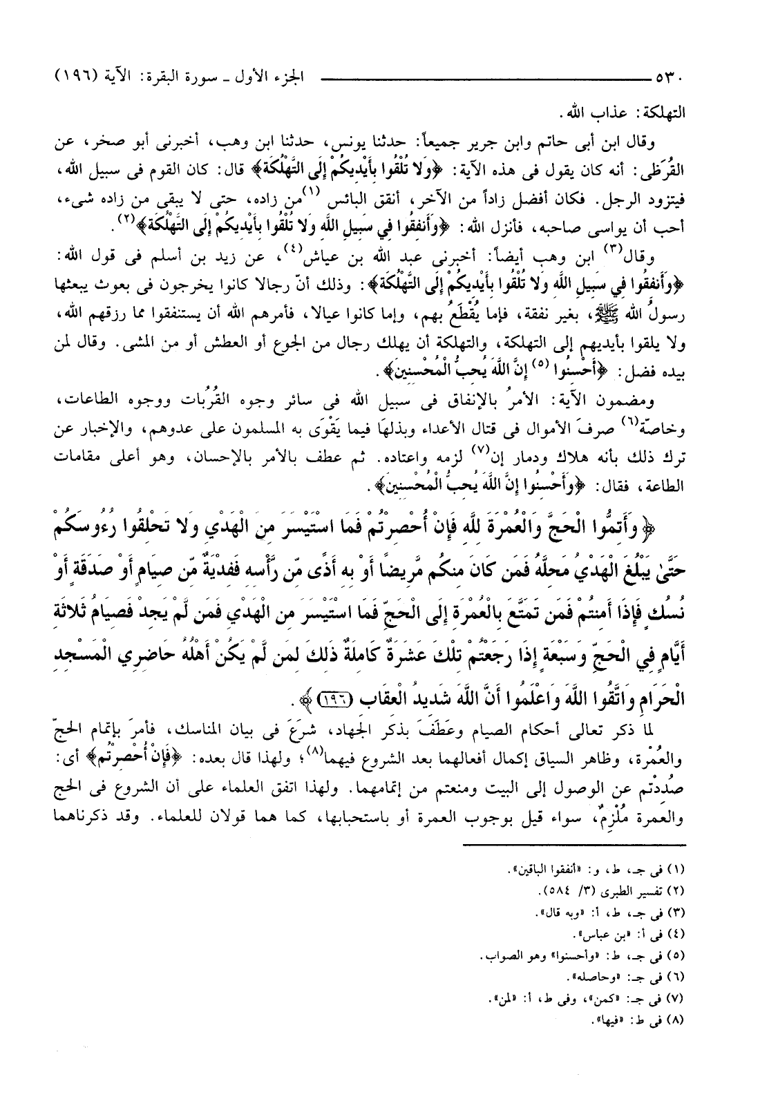 وقال (3) ابْنُ وَهْبٍ أَيْضًا: أَخْبَرَنِي عَبْدُ اللَّهِ بْنُ عَيَّاشٍ (4) عَنْ زَيْدِ بْنِ أَسْلَمَ فِي قَوْلِ الله: {وَأَنْفِقُوا فِي سَبِيلِ اللَّهِ وَلا تُلْقُوا بِأَيْدِيكُمْ إِلَى التَّهْلُكَةِ} وَذَلِكَ أَنَّ رِجَالًا كَانُوا يَخْرُجُونَ فِي بُعُوثٍ يَبْعَثُهَا رَسُولُ اللَّهِ صَلَّى اللَّهُ عَلَيْهِ وَسَلَّمَ، بِغَيْرِ نَفَقَةٍ، فَإِمَّا يُقْطَعُ بِهِمْ، وَإِمَّا كَانُوا عِيَالًا فَأَمَرَهُمُ اللَّهُ أَنْ يَسْتَنْفِقُوا مِمَّا رَزَقَهُمُ اللَّهُ، وَلَا يُلْقُوا بِأَيْدِيهِمْ إِلَى التَّهْلُكَةِ، وَالتَّهْلُكَةُ أَنْ يَهْلَكَ رِجَالٌ مِنَ الْجُوعِ أَوِ الْعَطَشِ أَوْ مِنَ الْمَشْيِ. وَقَالَ لِمَنْ بِيَدِهِ فَضْلٌ: {وَأَحْسِنُوا إِنَّ اللَّهَ يُحِبُّ الْمُحْسِنِينَ}