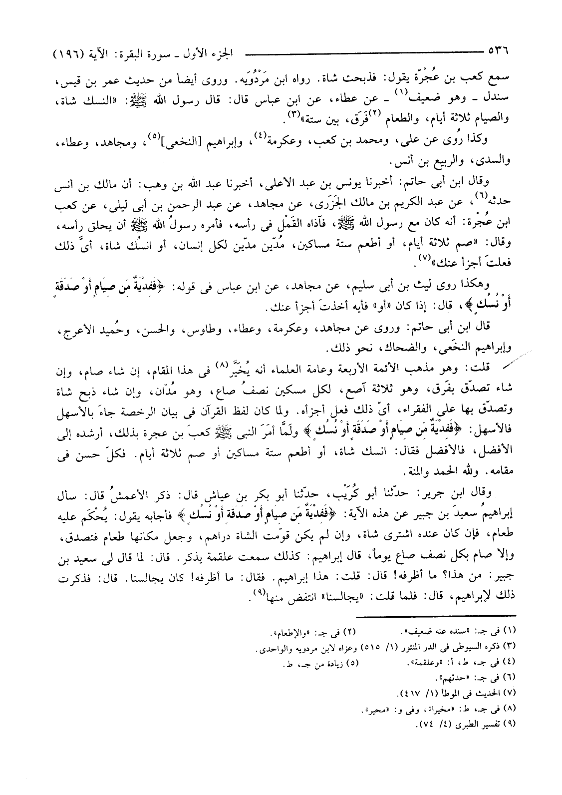 قُلْتُ: وَهُوَ مَذْهَبُ الْأَئِمَّةِ الْأَرْبَعَةِ وَعَامَّةُ الْعُلَمَاءِ أَنَّهُ يُخَيَّر (8) فِي هَذَا الْمَقَامِ، إِنْ شَاءَ صَامَ، وَإِنْ شَاءَ تَصَدَّقُ بفَرق، وَهُوَ ثَلَاثَةٌ آصُعٍ، لِكُلِّ مِسْكِينٍ نصفُ صَاعٍ، وَهُوَ مُدّان، وَإِنْ شَاءَ ذَبَحَ شَاةً وَتَصَدَّقَ بِهَا عَلَى الْفُقَرَاءِ، أَيَّ ذَلِكَ فَعَلَ أَجْزَأَهُ. وَلَمَّا كَانَ لَفْظُ الْقُرْآنِ فِي بَيَانِ الرُّخْصَةِ جاءَ بِالْأَسْهَلِ فَالْأَسْهَلِ: {فَفِدْيَةٌ مِنْ صِيَامٍ أَوْ صَدَقَةٍ أَوْ نُسُكٍ} وَلَمَّا أمَرَ النَّبِيُّ صَلَّى اللَّهُ عَلَيْهِ وَسَلَّمَ كعبَ بْنَ عُجْرَةَ بِذَلِكَ، أَرْشَدَهُ إِلَى الْأَفْضَلِ، فَالْأَفْضَلِ فَقَالَ: انْسُكْ شَاةً، أَوْ أَطْعِمْ سِتَّةَ مَسَاكِينَ أَوْ صُمْ ثَلَاثَةَ أَيَّامٍ. فَكُلٌّ حَسَنٌ فِي مَقَامِهِ. وَلِلَّهِ الْحَمْدُ وَالْمِنَّةُ.