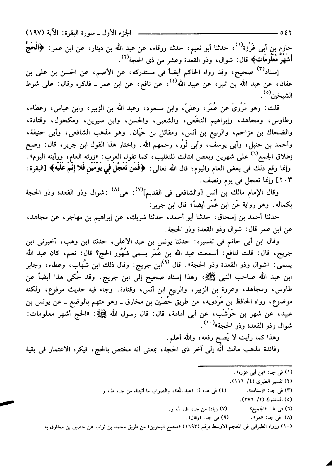 وَقَالَ ابْنُ أَبِي حَاتِمٍ فِي تَفْسِيرِهِ: حَدَّثَنَا يُونُسُ بْنُ عَبْدِ الْأَعْلَى، حَدَّثَنَا ابْنُ وَهْبٍ، أَخْبَرَنِي ابْنُ جُرَيْجٍ، قَالَ: قُلْتُ لَنَافِعٍ: أَسْمَعْتَ عَبْدَ اللَّهِ بْنَ عُمَر يُسَمِّي شُهُور الْحَجِّ؟ قَالَ: نَعَمْ، كَانَ عَبْدُ اللَّهِ يُسَمِّي: "شَوَّالٌ وَذُو الْقِعْدَةِ وَذُو الْحِجَّةِ". قَالَ (9) ابْنُ جُرَيْجٍ: وَقَالَ ذَلِكَ ابْنُ شُهاب، وَعَطَاءٌ، وَجَابِرُ بْنُ عَبْدِ اللَّهِ صَاحِبُ النَّبِيِّ صَلَّى اللَّهُ عَلَيْهِ وَسَلَّمَ، وَهَذَا إِسْنَادٌ صَحِيحٌ إِلَى ابْنِ جُرَيْجٍ. وَقَدْ حُكي هَذَا أَيْضًا عَنْ طَاوُسٍ، وَمُجَاهِدٍ، وَعُرْوَةَ بْنِ الزُّبَيْرِ، وَالرَّبِيعِ بْنِ أَنَسٍ، وَقَتَادَةَ. وَجَاءَ فِيهِ حَدِيثٌ مَرْفُوعٌ، وَلَكِنَّهُ مَوْضُوعٌ، رَوَاهُ الحافظ بن مَرْدويه، مِنْ طَرِيقِ حُصَين بْنِ مُخَارِقٍ -وَهُوَ مُتَّهَمٌ بِالْوَضْعِ -عَنْ يُونُسَ بْنِ عُبَيْدٍ، عَنْ شَهْرِ بْنِ حَوْشَب، عَنْ أَبِي أُمَامَةَ، قَالَ: قَالَ رَسُولُ اللَّهِ صَلَّى اللَّهُ عَلَيْهِ وَسَلَّمَ: "الْحَجُّ أَشْهَرٌ مَعْلُومَاتٌ: شَوَّالٌ وَذُو الْقِعْدَةِ وَذُو الْحِجَّةِ" (10) .