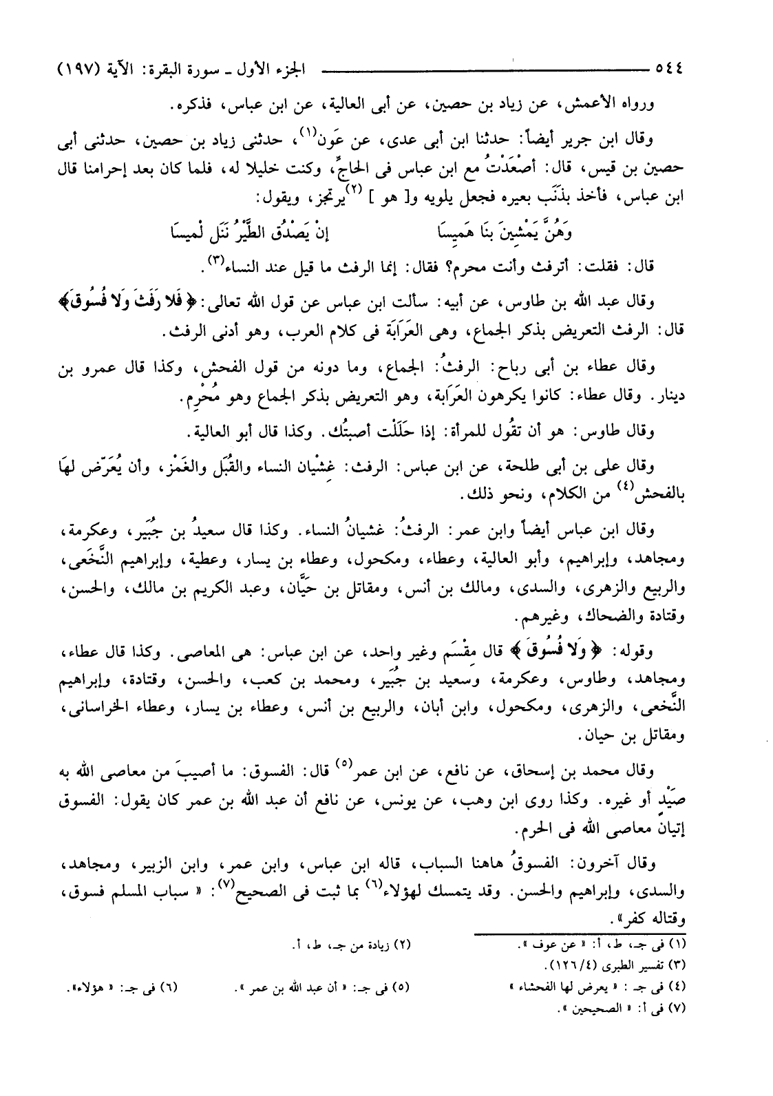 وَقَالَ ابْنُ عَبَّاسٍ أَيْضًا وَابْنُ عُمَرَ: الرفثُ: غشيانُ النِّسَاءِ. وَكَذَا قَالَ سعيدُ بْنُ جُبَير، وَعِكْرِمَةُ، وَمُجَاهِدٌ، وَإِبْرَاهِيمُ، وَأَبُو الْعَالِيَةِ، وَعَطَاءٌ، وَمَكْحُولٌ، وَعَطَاءُ بْنُ يَسَارٍ، وَعَطِيَّةُ، وَإِبْرَاهِيمُ النَّخَعي، وَالرَّبِيعُ، وَالزُّهْرِيُّ، وَالسُّدِّيُّ، وَمَالِكُ بْنُ أَنَسٍ، وَمُقَاتِلُ بْنُ حَيَّان، وَعَبْدُ الْكَرِيمِ بْنُ مَالِكٍ، وَالْحَسَنُ، وَقَتَادَةُ وَالضَّحَّاكُ، وَغَيْرُهُمْ.