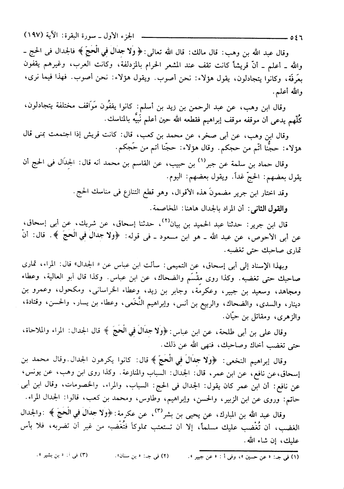 قَالَ ابْنُ جَرِيرٍ: حَدَّثَنَا عَبْدُ الْحَمِيدِ بْنُ بَيَانٍ (2) حَدَّثَنَا إِسْحَاقُ، عَنْ شَرِيكٍ، عَنْ أَبِي إِسْحَاقَ، عَنْ أَبِي الْأَحْوَصِ، عَنْ عَبْدِ اللَّهِ -هُوَ ابْنُ مَسْعُودٍ -فِي قَوْلِهِ: {وَلا جِدَالَ فِي الْحَجِّ} قَالَ: أنْ تُمَارِيَ صَاحِبَكَ حَتَّى تُغْضِبَهُ.
