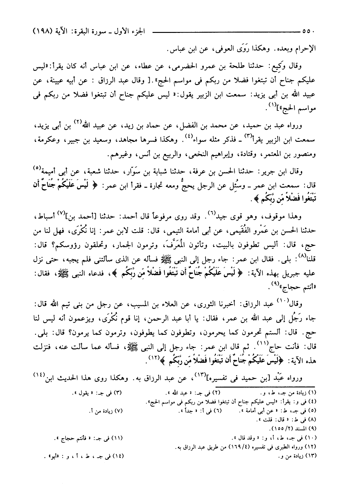 وَقَالَ (10) عَبْدُ الرَّزَّاقِ: أَخْبَرَنَا الثَّوْرِيُّ، عَنِ الْعَلَاءِ بْنِ الْمُسَيَّبِ، عَنْ رَجُلٍ مِنْ بَنِي تَيْمِ اللَّهِ قَالَ: جَاءَ رَجُل إِلَى عَبْدِ اللَّهِ بْنِ عُمَرَ، فَقَالَ: يَا أَبَا عَبْدِ الرَّحْمَنِ، إِنَّا قَوْمٌ نُكْرَي، وَيَزْعُمُونَ أَنَّهُ لَيْسَ لَنَا حَجٌّ. قَالَ: أَلَسْتُمْ تُحْرِمُونَ كَمَا يُحْرِمُونَ، وَتَطُوفُونَ كَمَا يَطُوفُونَ، وَتَرْمُونَ كَمَا يَرْمُونَ؟ قَالَ: بَلَى. قَالَ: فَأَنْتَ حَاجٌّ (11) . ثُمَّ قَالَ ابْنُ عُمَرَ: جَاءَ رَجُلٌ إِلَى النَّبِيِّ صَلَّى اللَّهُ عَلَيْهِ وَسَلَّمَ، فَسَأَلَهُ عَمَّا سَأَلْتَ عَنْهُ، فَنَزَلَتْ هَذِهِ الْآيَةُ: {لَيْسَ عَلَيْكُمْ جُنَاحٌ أَنْ تَبْتَغُوا فَضْلا مِنْ رَبِّكُمْ} (12) .