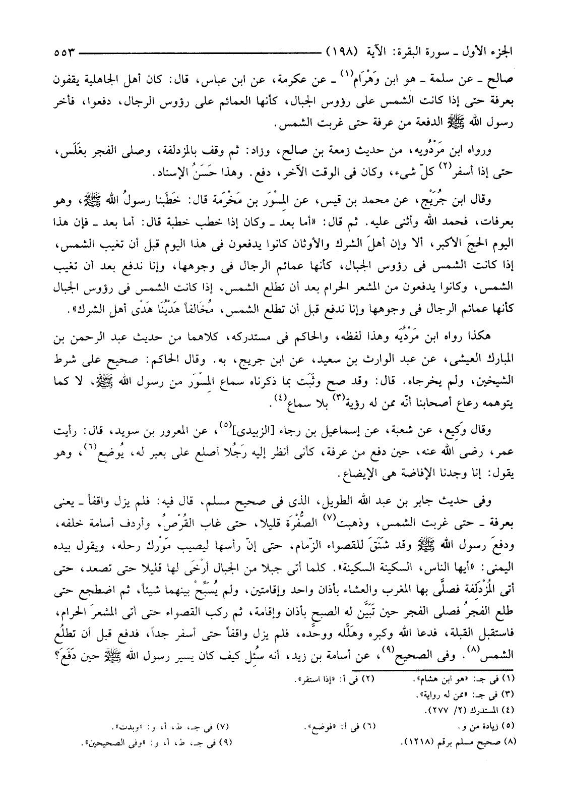 وَفِي حَدِيثِ جَابِرِ بْنِ عَبْدِ اللَّهِ الطَّوِيلِ، الذِي فِي صَحِيحِ مُسْلِمٍ، قَالَ فِيهِ: فَلَمْ يَزَلْ وَاقِفًا -يَعْنِي بِعَرَفَةَ -حَتَّى غَرَبَتِ الشَّمْسُ، وَذَهَبَتِ (7) الصُّفْرَة قَلِيلًا حَتَّى غَابَ القُرْصُ، وَأَرْدَفَ أُسَامَةَ خَلْفَهُ، ودفعَ رسول الله صلى الله عليه وسلم وقد شَنَقَ لِلْقَصْوَاءِ الزِّمَامَ، حَتَّى إِنَّ رَأْسَهَا لَيُصِيبُ مَوْرك رَحْلِهِ، وَيَقُولُ بِيَدِهِ الْيُمْنَى: "أَيُّهَا النَّاسُ، السَّكِينَةَ السَّكِينَةَ". كُلَّمَا أَتَى جَبَلًا مِنَ الْجِبَالِ أرْخَى لَهَا قَلِيلًا حَتَّى تَصْعَدَ، حَتَّى أَتَى المُزْدَلِفة فَصَلَّى بِهَا الْمَغْرِبَ وَالْعِشَاءَ بِأَذَانٍ وَاحِدٍ وَإِقَامَتَيْنِ، وَلَمْ يُسَبِّحْ بَيْنَهُمَا شَيْئًا، ثُمَّ اضْطَجَعَ حَتَّى طَلُعَ الفَجرُ فَصَلَّى الْفَجْرَ حِينَ تَبَيَّن لَهُ الصُّبْحُ بِأَذَانٍ وَإِقَامَةٍ، ثُمَّ رَكِبَ الْقَصْوَاءَ حَتَّى أَتَى المشعرَ الْحَرَامَ، فَاسْتَقْبَلَ الْقِبْلَةَ، فَدَعَا اللَّهَ وَكَبَّرَهُ وهَلَّله ووحَّده، فَلَمْ يَزَلْ وَاقِفًا حَتَّى أَسْفَرَ جِدًّا، فَدَفَعَ قَبْلَ أَنْ تطلُع الشَّمْسُ (8) وَفِي الصَّحِيحِ (9) عَنْ أُسَامَةَ بْنِ زَيْدٍ، أَنَّهُ سُئِل كَيْفَ كَانَ يَسِيرُ رَسُولُ اللَّهِ صلى الله عليه وسلم حين دَفَعَ؟