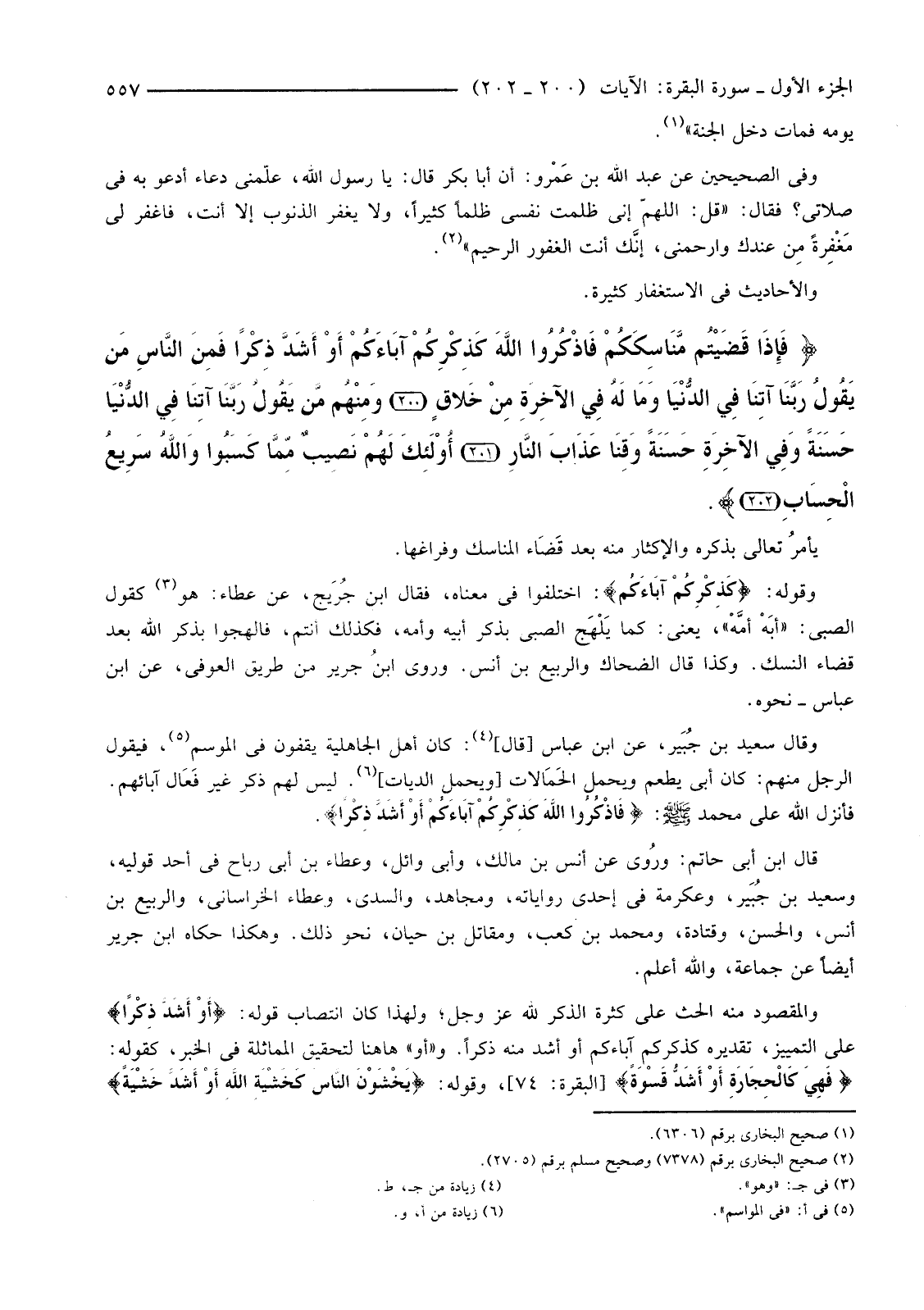 {فَإِذَا قَضَيْتُمْ مَنَاسِكَكُمْ فَاذْكُرُوا اللَّهَ كَذِكْرِكُمْ آبَاءَكُمْ أَوْ أَشَدَّ ذِكْرًا فَمِنَ النَّاسِ مَنْ يَقُولُ رَبَّنَا آتِنَا فِي الدُّنْيَا وَمَا لَهُ فِي الآخِرَةِ مِنْ خَلاقٍ (200) وَمِنْهُمْ مَنْ يَقُولُ رَبَّنَا آتِنَا فِي الدُّنْيَا حَسَنَةً وَفِي الآخِرَةِ حَسَنَةً وَقِنَا عَذَابَ النَّارِ (201) أُولَئِكَ لَهُمْ نَصِيبٌ مِمَّا كَسَبُوا وَاللَّهُ سَرِيعُ الْحِسَابِ (202) }