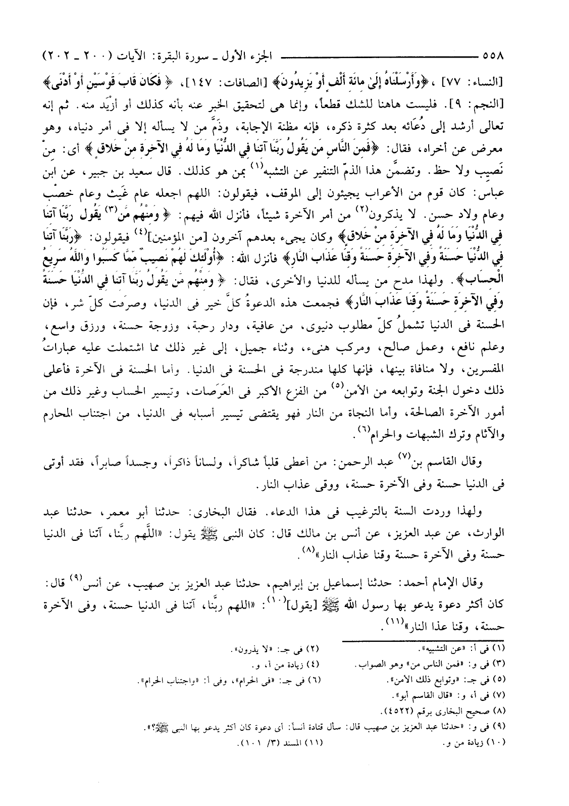 وَلِهَذَا وَرَدَتِ السُّنَّةُ بِالتَّرْغِيبِ فِي هَذَا الدُّعَاءِ. فَقَالَ الْبُخَارِيُّ: حَدَّثَنَا أَبُو مَعْمَرٍ، حَدَّثَنَا عَبْدُ الْوَارِثِ، عَنْ عَبْدِ الْعَزِيزِ، عَنْ أَنَسِ بْنِ مَالِكٍ قَالَ: كَانَ النَّبِيُّ صَلَّى اللَّهُ عَلَيْهِ وَسَلَّمَ يَقُولُ: "اللَّهم ربَّنا، آتِنَا فِي الدُّنْيَا حَسَنَةً وَفِي الْآخِرَةِ حَسَنَةً وَقِنَا عَذَابَ النَّارِ" (8) .