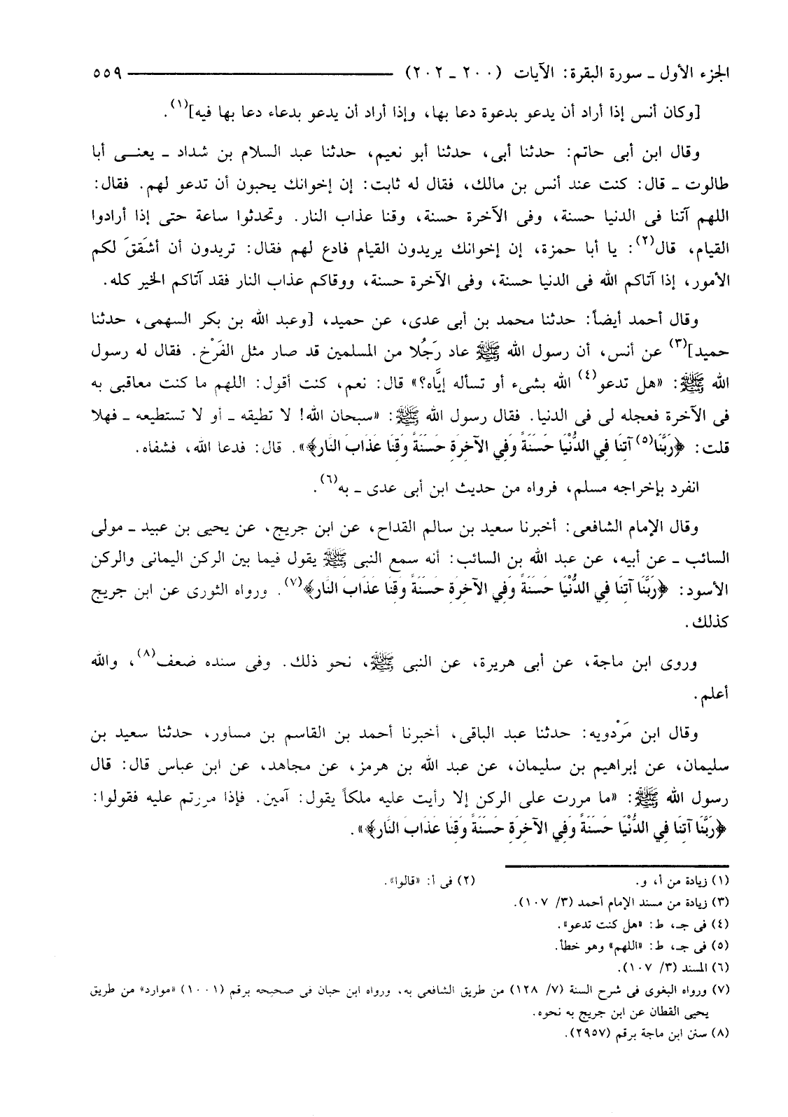 وَقَالَ ابْنُ أَبِي حَاتِمٍ: حَدَّثَنَا أَبِي، حَدَّثَنَا أَبُو نُعَيْمٍ، حَدَّثَنَا عَبْدُ السَّلَامِ بْنُ شَدَّادٍ -يَعْنِي أَبَا طَالُوتَ -قَالَ: كُنْتُ عِنْدَ أَنَسِ بْنِ مَالِكٍ، فَقَالَ لَهُ ثَابِتٌ: إِنَّ إِخْوَانَكَ يُحِبُّونَ أَنْ تَدْعُوَ لَهُمْ. فَقَالَ: اللَّهُمَّ آتِنَا فِي الدُّنْيَا حَسَنَةً، وَفِي الْآخِرَةِ حَسَنَةً، وَقِنَا عَذَابَ النَّارِ. وَتَحَدَّثُوا سَاعَةً حَتَّى إِذَا أَرَادُوا الْقِيَامَ، قَالَ (2) : يَا أَبَا حَمْزَةَ، إِنَّ إِخْوَانَكَ يُرِيدُونَ الْقِيَامَ فَادْعُ لَهُمْ فَقَالَ: تُرِيدُونَ أَنْ أشَققَ لَكُمُ الْأُمُورَ، إِذَا آتَاكُمُ اللَّهُ فِي الدُّنْيَا حَسَنَةً، وَفِي الْآخِرَةِ حَسَنَةً، وَوَقَاكُمْ عَذَابَ النَّارِ فَقَدْ آتَاكُمُ الْخَيْرَ كُلَّهُ.