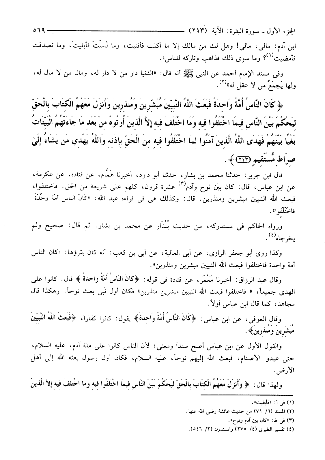 {كَانَ النَّاسُ أُمَّةً وَاحِدَةً فَبَعَثَ اللَّهُ النَّبِيِّينَ مُبَشِّرِينَ وَمُنْذِرِينَ وَأَنزلَ مَعَهُمُ الْكِتَابَ بِالْحَقِّ لِيَحْكُمَ بَيْنَ النَّاسِ فِيمَا اخْتَلَفُوا فِيهِ وَمَا اخْتَلَفَ فِيهِ إِلا الَّذِينَ أُوتُوهُ مِنْ بَعْدِ مَا جَاءَتْهُمُ الْبَيِّنَاتُ بَغْيًا بَيْنَهُمْ فَهَدَى اللَّهُ الَّذِينَ آمَنُوا لِمَا اخْتَلَفُوا فِيهِ مِنَ الْحَقِّ بِإِذْنِهِ وَاللَّهُ يَهْدِي مَنْ يَشَاءُ إِلَى صِرَاطٍ مُسْتَقِيمٍ (213) }