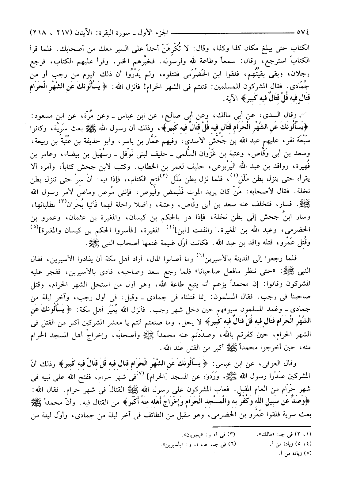 الْكِتَابَ حَتَّى يَبْلُغَ مَكَانَ كَذَا وَكَذَا، وَقَالَ: لَا تُكْرِهَنّ أَحَدًا عَلَى السَّيْرِ مَعَكَ مِنْ أَصْحَابِكَ. فَلَمَّا قَرَأَ الكتابَ اسْتَرْجَعَ، وَقَالَ: سَمْعًا وَطَاعَةً لِلَّهِ وَلِرَسُولِهِ. فخبَّرهم الْخَبَرَ، وَقَرَأَ عَلَيْهِمُ الْكِتَابَ، فَرَجَعَ رَجُلَانِ، وَبَقِيَ بقيَّتُهم، فَلَقُوا ابْنَ الحَضْرَمي فَقَتَلُوهُ، وَلَمْ يَدْرُوا أَنَّ ذَلِكَ الْيَوْمَ مِنْ رَجَبٍ أَوْ مِنْ جُمَادى. فَقَالَ الْمُشْرِكُونَ لِلْمُسْلِمِينَ: قَتَلْتُمْ فِي الشَّهْرِ الْحَرَامِ! فَأَنْزَلَ اللَّهُ: {يَسْأَلُونَكَ عَنِ الشَّهْرِ الْحَرَامِ قِتَالٍ فِيهِ قُلْ قِتَالٌ فِيهِ كَبِيرٌ} الْآيَةَ.