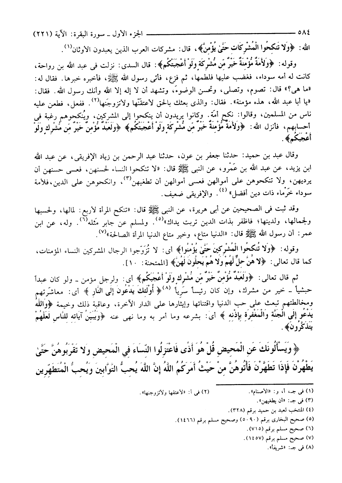 اللَّهِ: {وَلا تَنْكِحُوا الْمُشْرِكَاتِ حَتَّى يُؤْمِنَّ} قَالَ: مُشْرِكَاتُ الْعَرَبِ الَّذِينَ يَعْبُدُونَ الْأَوْثَانَ (1) .