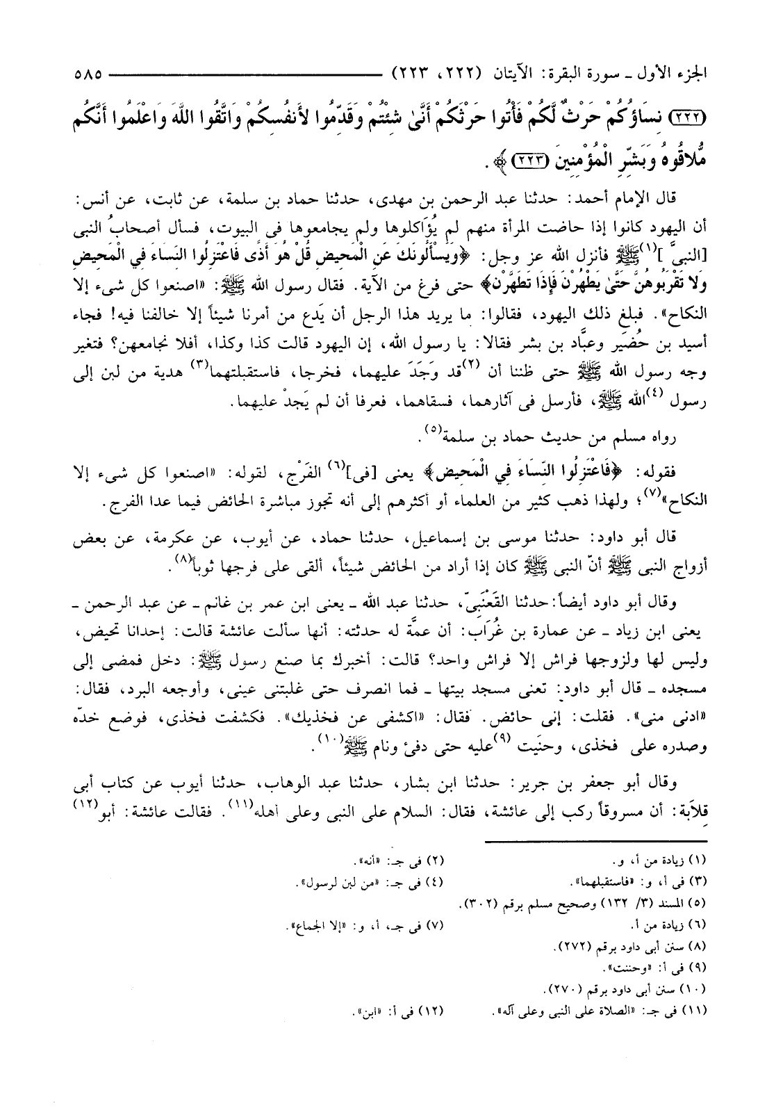 قَالَ الْإِمَامُ أَحْمَدُ: حَدَّثَنَا عَبْدُ الرَّحْمَنِ بْنُ مَهْدِيٍّ، حَدَّثَنَا حَمَّادُ بْنُ سَلَمَةَ، عَنْ ثَابِتٍ، عَنْ أَنَسٍ: أَنَّ الْيَهُودَ كَانُوا إِذَا حَاضَتِ الْمَرْأَةُ مِنْهُمْ لَمْ يُؤَاكلوها وَلَمْ يُجَامِعُوهَا فِي الْبُيُوتِ، فَسَأَلَ أصحابُ النَّبِيِّ [النبيَّ] (1) صَلَّى اللَّهُ عَلَيْهِ وَسَلَّمَ فَأَنْزَلَ اللَّهُ عَزَّ وَجَلَّ: {وَيَسْأَلُونَكَ عَنِ الْمَحِيضِ قُلْ هُوَ أَذًى فَاعْتَزِلُوا النِّسَاءَ فِي الْمَحِيضِ وَلا تَقْرَبُوهُنَّ حَتَّى يَطْهُرْنَ فَإِذَا تَطَهَّرْنَ} حَتَّى فَرَغَ مِنَ الْآيَةِ. فَقَالَ رَسُولُ اللَّهِ صَلَّى اللَّهُ عَلَيْهِ وَسَلَّمَ: "اصْنَعُوا كُلَّ شَيْءٍ إِلَّا النِّكَاحَ". فَبَلَغَ ذَلِكَ الْيَهُودَ، فَقَالُوا: مَا يُرِيدُ هَذَا الرَّجُلُ أَنْ يَدع مِنْ أَمْرِنَا شَيْئًا إِلَّا خَالَفَنَا فِيهِ! فَجَاءَ أُسَيْدُ بْنُ حُضَير وعبَّاد بْنُ بِشْرٍ فَقَالَا يَا رَسُولَ اللَّهِ، إِنَّ الْيَهُودَ قَالَتْ كَذَا وَكَذَا، أَفَلَا نُجَامِعُهُنَّ؟ فَتَغَيَّرَ وَجْهُ رَسُولِ اللَّهِ صَلَّى اللَّهُ عَلَيْهِ وَسَلَّمَ حَتَّى ظَنَنَّا أَنْ (2) قَدْ وَجَدَ عَلَيْهِمَا، فَخَرَجَا، فَاسْتَقْبَلَتْهُمَا (3) هَدِيَّةٌ مِنْ لَبَنٍ إلى رسول (4) الله صلى الله عليه وسلم، فَأَرْسَلَ فِي آثَارِهِمَا، فَسَقَاهُمَا، فَعَرَفَا أَنْ لَمْ يَجدْ عَلَيْهِمَا.