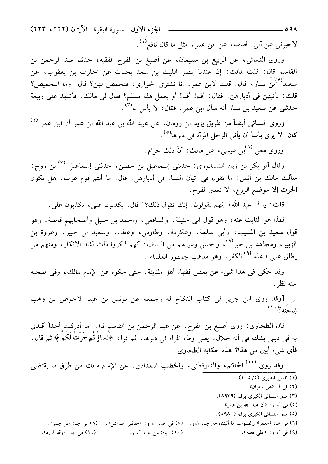 قَالَ الطَّحَاوِيُّ: رَوَى أَصْبُغُ بْنُ الْفَرَجِ، عَنْ عَبْدِ الرَّحْمَنِ بْنِ الْقَاسِمِ قَالَ: مَا أَدْرَكْتُ أَحَدًا أَقْتَدِي بِهِ فِي دِينِي يَشُكُّ أَنَّهُ حَلَالٌ. يَعْنِي وَطْءَ الْمَرْأَةِ فِي دُبُرِهَا، ثُمَّ قَرَأَ: {نِسَاؤُكُمْ حَرْثٌ لَكُمْ} ثُمَّ قَالَ: فَأَيُّ شَيْءٍ أَبْيَنُ مِنْ هَذَا؟ هَذِهِ حِكَايَةُ الطَّحَاوِيِّ.