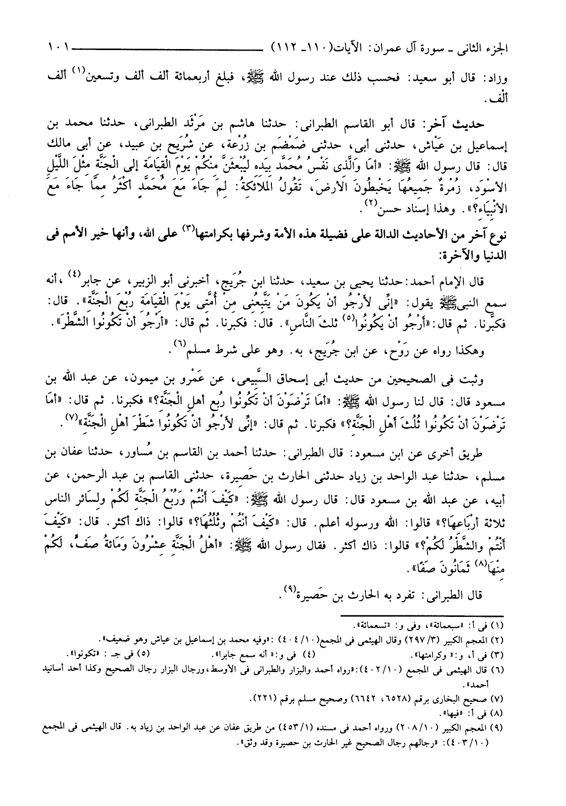 وَثَبَتَ فِي الصَّحِيحَيْنِ مِنْ حَدِيثِ أَبِي إِسْحَاقَ السَّبِيعي، عَنْ عَمْرو بْنِ مَيْمُونٍ، عَنْ عَبْدِ اللَّهِ بْنِ مَسْعُودٍ قَالَ: قَالَ لَنَا رَسُولُ اللَّهِ صَلَّى اللَّهُ عَلَيْهِ وَسَلَّمَ: "أمَا تَرْضَوْنَ أنْ تَكُونُوا رُبْعَ أَهْلِ الْجَنِّةِ؟ " فَكَبَّرْنَا. ثُمَّ قَالَ: "أَمَا تَرْضَوْنَ أنْ تَكُونُوا ثُلُثَ أَهْلَ الْجَنَّةِ؟ " فَكَبَّرْنَا. ثُمَّ قَالَ: "إنِّي لأرْجُو أنْ تَكُونُوا شَطْرَ أَهْلِ الْجَنَّة" (7) .
