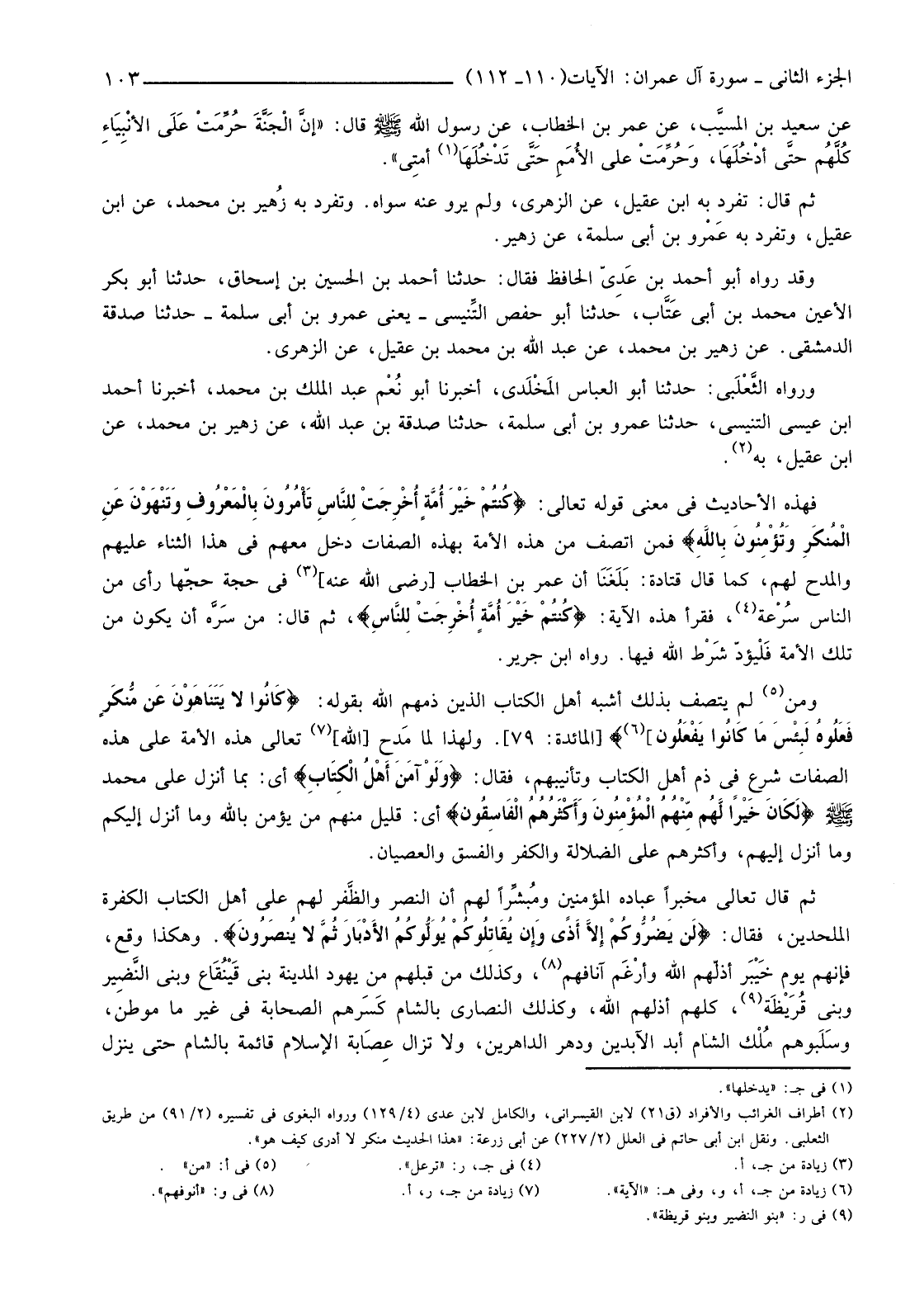 فَهَذِهِ الْأَحَادِيثُ فِي مَعْنَى قَوْلِهِ تَعَالَى: {كُنْتُمْ خَيْرَ أُمَّةٍ أُخْرِجَتْ لِلنَّاسِ تَأْمُرُونَ بِالْمَعْرُوفِ وَتَنْهَوْنَ عَنِ الْمُنْكَرِ وَتُؤْمِنُونَ بِاللَّهِ} فَمَنِ اتَّصَفَ مِنْ هَذِهِ الْأُمَّةِ بِهَذِهِ الصِّفَاتِ دَخَلَ مَعَهُمْ فِي هَذَا الثَّنَاءِ عَلَيْهِمْ وَالْمَدْحِ لَهُمْ، كَمَا قَالَ قَتَادَةُ: بَلَغَنَا أَنَّ عُمَرَ بْنَ الْخَطَّابِ [رَضِيَ اللَّهُ عَنْهُ] (3) فِي حَجَّةٍ حَجَّهَا رَأَى مِنَ النَّاسِ سُرْعة (4) فَقَرَأَ هَذِهِ الْآيَةَ: {كُنْتُمْ خَيْرَ أُمَّةٍ أُخْرِجَتْ لِلنَّاسِ} ثُمَّ قَالَ: مَنْ سَرَّه أَنْ يَكُونَ مِنْ تِلْكَ الْأُمَّةِ فَلْيؤدّ شَرْط اللَّهِ فِيهَا. رَوَاهُ ابْنُ جَرِيرٍ.