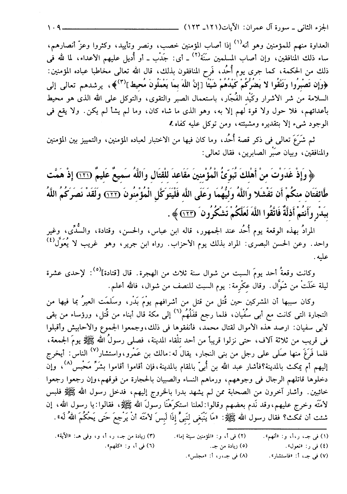 ثُمَّ شَرَعَ تَعَالَى فِي ذِكْرِ قِصَّةِ أُحُدٍ، وَمَا كَانَ فِيهَا مِنَ الِاخْتِبَارِ لِعِبَادِهِ الْمُؤْمِنِينَ، وَالتَّمْيِيزِ بَيْنَ الْمُؤْمِنِينَ وَالْمُنَافِقِينَ، وَبَيَانِ صَبْر الصَّابِرِينَ، فَقَالَ تَعَالَى: