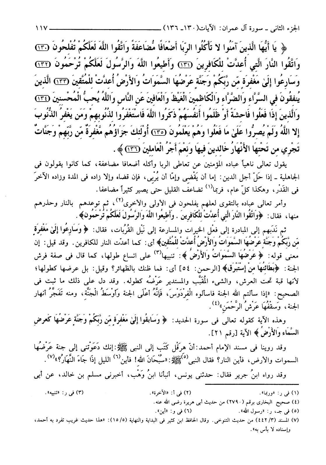 {وَسَارِعُوا إِلَى مَغْفِرَةٍ مِنْ رَبِّكُمْ وَجَنَّةٍ عَرْضُهَا السَّمَاوَاتُ وَالأرْضُ أُعِدَّتْ لِلْمُتَّقِينَ (133) الَّذِينَ يُنْفِقُونَ فِي السَّرَّاءِ وَالضَّرَّاءِ وَالْكَاظِمِينَ الْغَيْظَ وَالْعَافِينَ عَنِ النَّاسِ وَاللَّهُ يُحِبُّ الْمُحْسِنِينَ (134) وَالَّذِينَ إِذَا فَعَلُوا فَاحِشَةً أَوْ ظَلَمُوا أَنْفُسَهُمْ ذَكَرُوا اللَّهَ فَاسْتَغْفَرُوا لِذُنُوبِهِمْ وَمَنْ يَغْفِرُ الذُّنُوبَ إِلا اللَّهُ وَلَمْ يُصِرُّوا عَلَى مَا فَعَلُوا وَهُمْ يَعْلَمُونَ (135) أُولَئِكَ جَزَاؤُهُمْ مَغْفِرَةٌ مِنْ رَبِّهِمْ وَجَنَّاتٌ تَجْرِي مِنْ تَحْتِهَا الأنْهَارُ خَالِدِينَ فِيهَا وَنِعْمَ أَجْرُ الْعَامِلِينَ (136) }