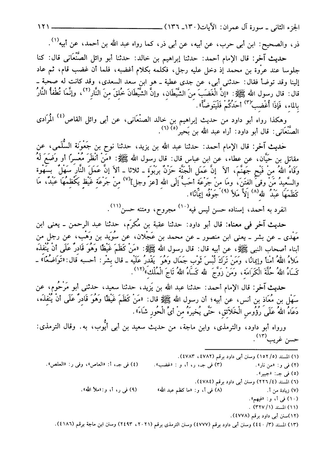 حَدِيثٌ آخَرُ فِي مَعْنَاهُ: قَالَ أَبُو دَاوُدَ: حَدَّثَنَا عُقْبَةُ بْنُ مُكرَم، حَدَّثَنَا عَبْدُ الرَّحْمَنِ -يَعْنِي ابْنَ مَهْدي-عَنْ بِشْرٍ -يَعْنِي ابْنَ مَنْصُورٍ-عَنْ مُحَمَّدِ بْنِ عَجْلان، عَنْ سُوَيد بْنِ وَهْب، عَنْ رَجُلٍ مِنْ أَبْنَاءِ أَصْحَابِ النَّبِيِّ صَلَّى اللَّهُ عَلَيْهِ وَسَلَّمَ، عَنْ أَبِيهِ قَالَ: قَالَ رَسُولُ اللَّهِ صَلَّى اللَّهُ عليه وسلم: "مَنْ كَظَمَ غَيْظًا وَهُوَ قَادِرٌ عَلَى أنْ يُنْفِذَه مَلأهُ اللهُ أَمْنًا وَإيمانًا، وَمَنْ تَرَكَ لُبْسَ ثَوْبِ جَمَال وَهُوَ يَقْدِرُ عَلَيْه -قَالَ بِشر: أَحْسَبُهُ قَالَ: "تَوَاضُعًا"-كَسَاهُ اللهُ حُلَّةَ الْكَرَامَةِ، وَمَنْ زَوَّجَ للهِ كَسَاهُ اللهُ تَاجَ الْمُلْكِ" (12) .